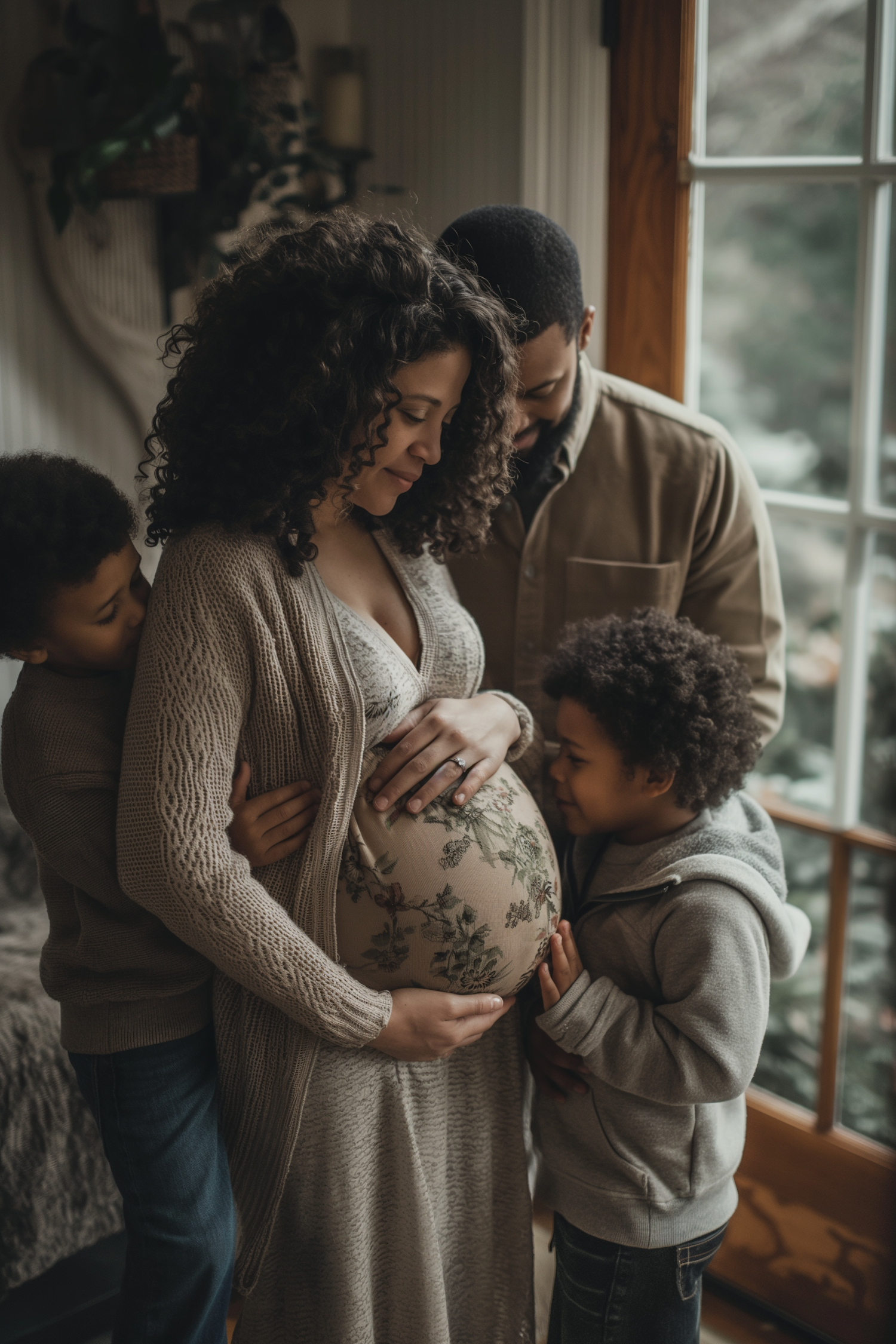 A loving family moment with a pregnant woman embraced by her partner and children, creating a warm and intimate scene.