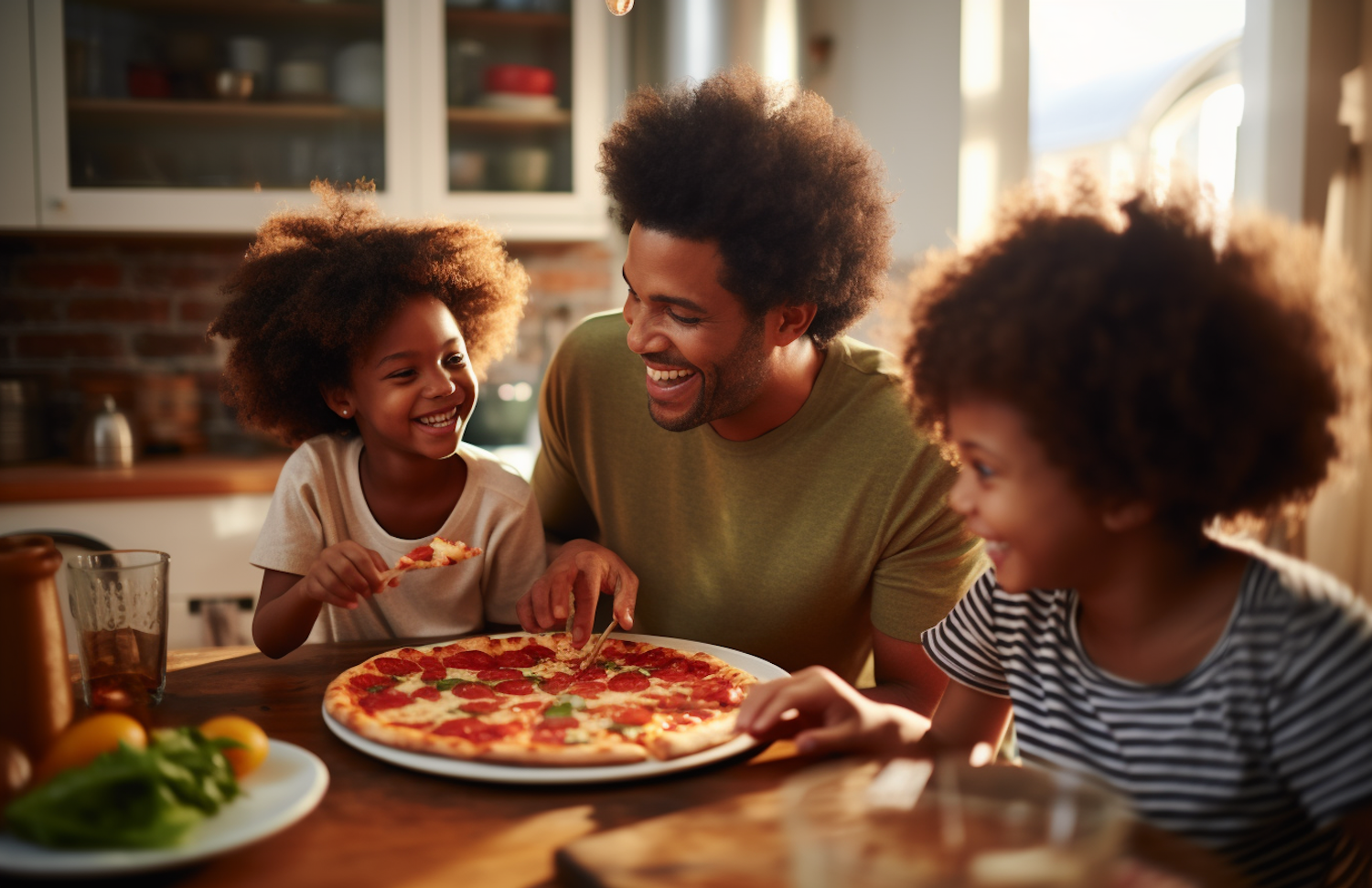 A joyful family shares a pizza meal in a cozy kitchen, filled with laughter and warmth. Perfect family bonding moment.