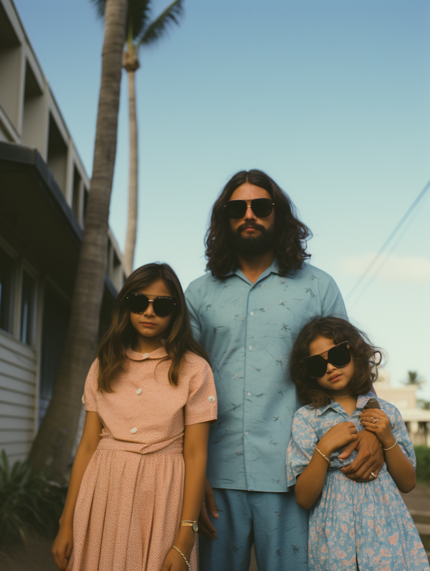 A man and two young girls in sunglasses pose outdoors, wearing coordinated outfits. The setting is tropical with a clear blue sky.