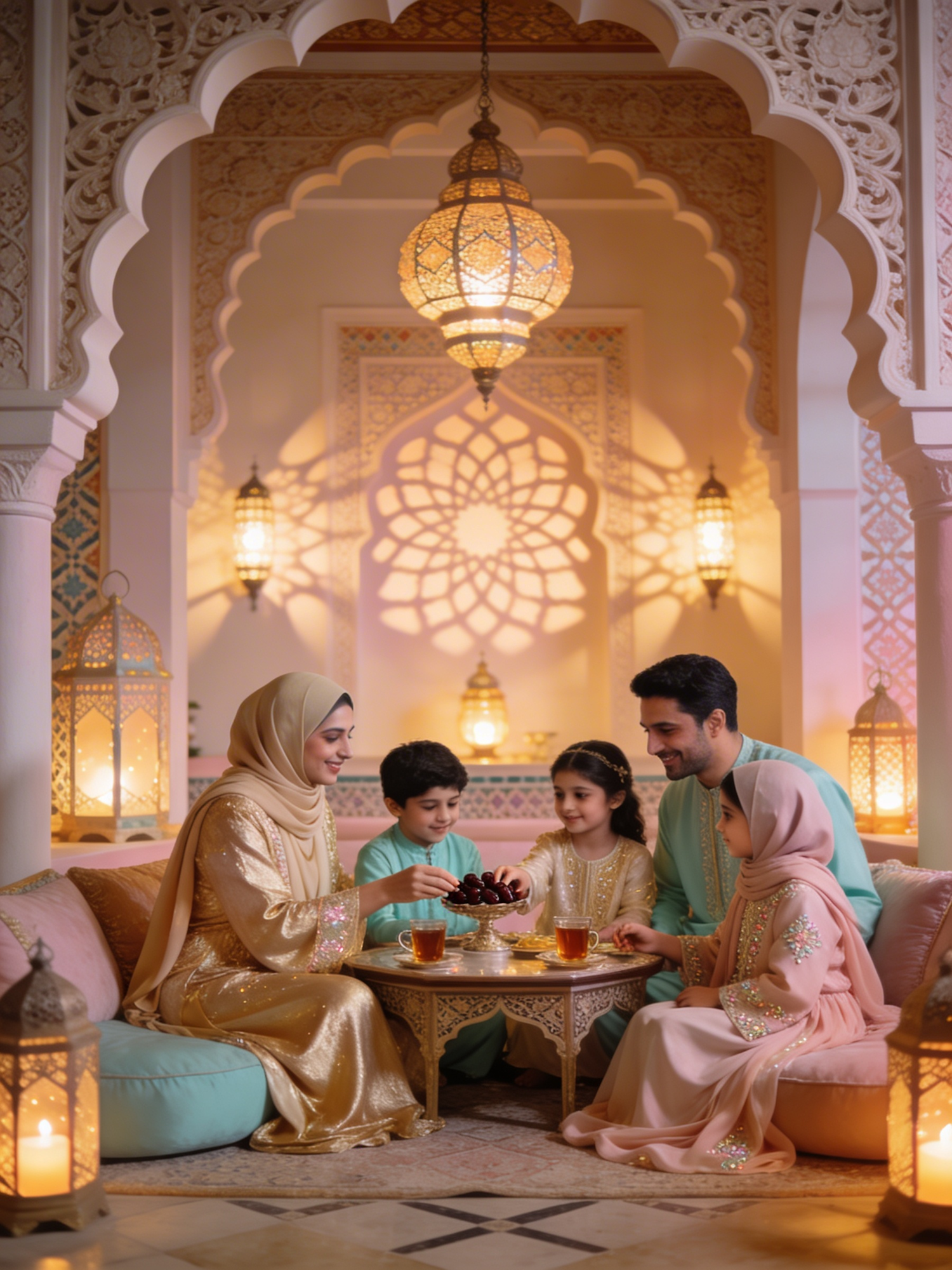 High‑definition portrait of a joyful Muslim family gathering in a Moroccan‑coded luxury Ramadan setting. Soft lantern glow, carved arches, patterned shadows, and a low table set with dates, tea, and pastel‑toned décor. Guests wear coordinated modest outfits in soft gold, mint, and blush, with flowing fabrics and subtle embroidery. Warm expressions, gentle interactions, and a serene, celebratory atmosphere capture the essence of a festive Ramadan evening.