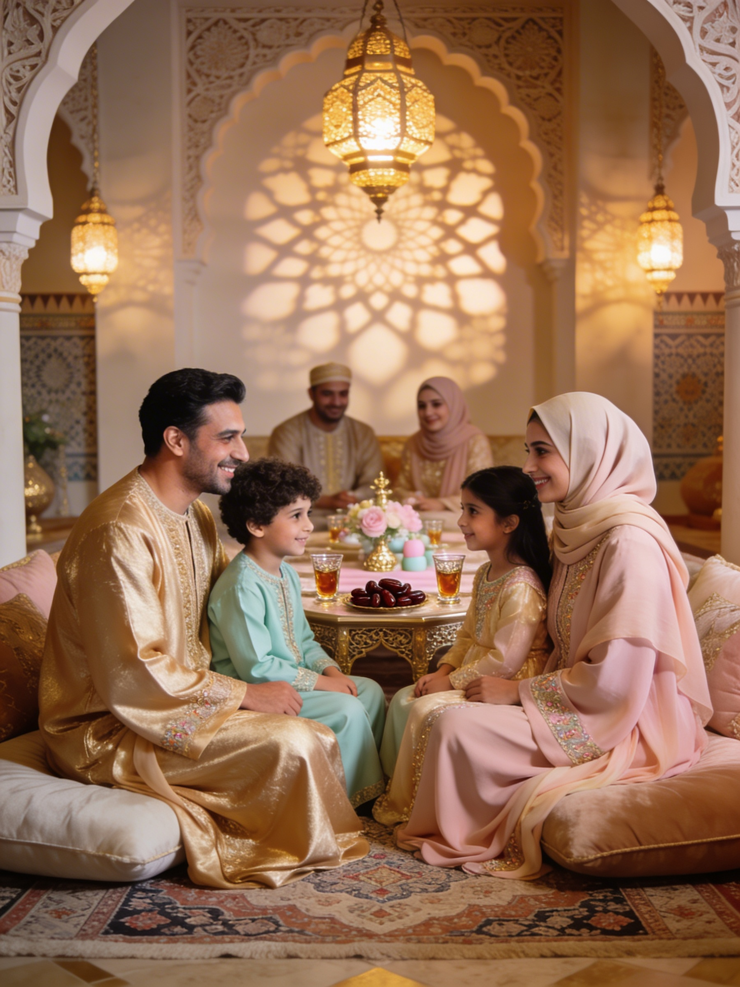 High‑definition portrait of a joyful Muslim family gathering in a Moroccan‑coded luxury Ramadan setting. Soft lantern glow, carved arches, patterned shadows, and a low table set with dates, tea, and pastel‑toned décor. Guests wear coordinated modest outfits in soft gold, mint, and blush, with flowing fabrics and subtle embroidery. Warm expressions, gentle interactions, and a serene, celebratory atmosphere capture the essence of a festive Ramadan evening.