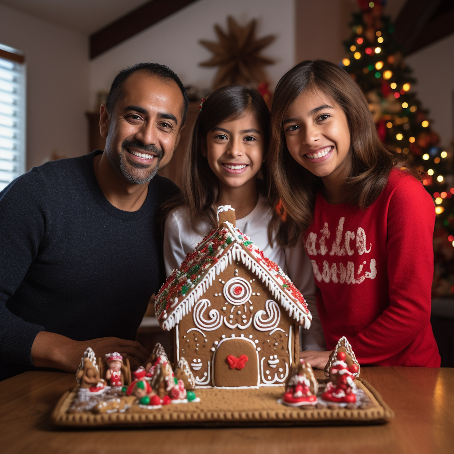 Family joyfully poses with a decorated gingerbread house, capturing holiday spirit with smiles and a festive Christmas tree in the background.