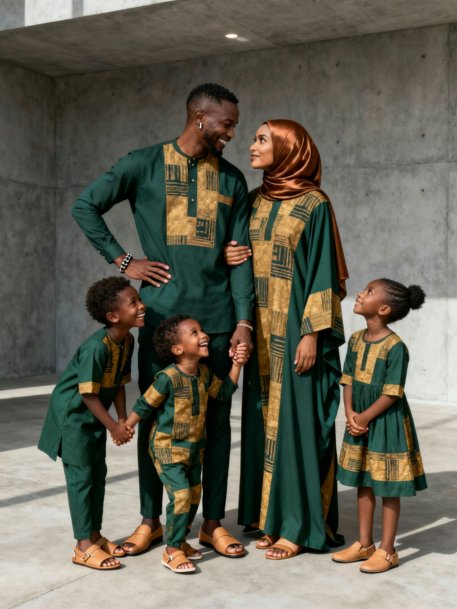 Full-body, high-definition portrait of a Black family of five—two adults and three children aged 5 to 6—standing together in a minimalist concrete interior. Their body language conveys warmth, familiarity, and joy, as if captured in a moment of togetherness and pride. All wear coordinated ensembles made from traditional African textiles, styled with elegance, modesty, and cultural depth. Adult Male Subject: He wears a tailored outfit in deep forest green and muted gold, featuring geometric motifs inspired by woven strip cloth or mud cloth. The long-sleeved shirt and trousers are structured yet relaxed. He stands with one hand resting lightly on his hip, the other arm gently placed around one of the children, smiling warmly with a subtle head tilt toward his partner. Adult Female Subject: She wears a coordinating kaftan in forest green and gold, styled modestly with long sleeves and a flowing silhouette. Her hijab is a complementary shade of warm bronze, styled simply to frame her face. She stands with one hand gently resting on her partner’s arm and the other holding the hand of a child. Her expression is serene and affectionate, with a soft gaze angled toward her family. Children (3 total, ages 5–6): Each child wears a playful, age-appropriate version of the family’s textile palette—perhaps tunics, jumpsuits, or dresses in forest green and gold with simplified patterns. One child stands between the parents, holding both their hands. Another leans slightly forward with a wide, joyful smile—adding spontaneity and emotional warmth. The third child stands slightly to the side, head tilted and hands clasped, looking up at a parent with admiration. Styling: The coordinated outfits create visual harmony while allowing each family member’s personality to shine. Accessories are minimal—perhaps a bracelet or small earrings for the adults. Footwear is clean and contemporary, such as tan loafers or sandals. The children wear comfortable shoes that match the palette. Setting & Mood: The background features textured gray concrete walls and a smooth concrete floor, creating a modern, architectural atmosphere that enhances the warm, earthy tones of their outfits. Soft, directional lighting casts gentle shadows that emphasize the folds of the garments and the emotional nuance of their poses. The overall mood is loving, sculptural, and culturally rich—ideal for a fashion editorial or visual archive celebrating modest African fashion, generational style, and family connection.