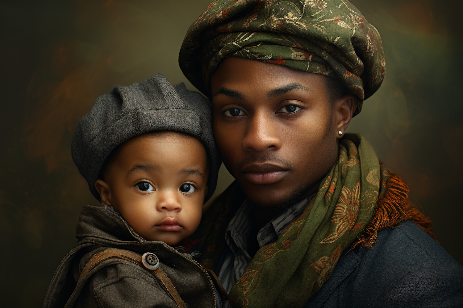 A serene portrait of a young man and baby in elegant attire, featuring rich textures and warm tones.