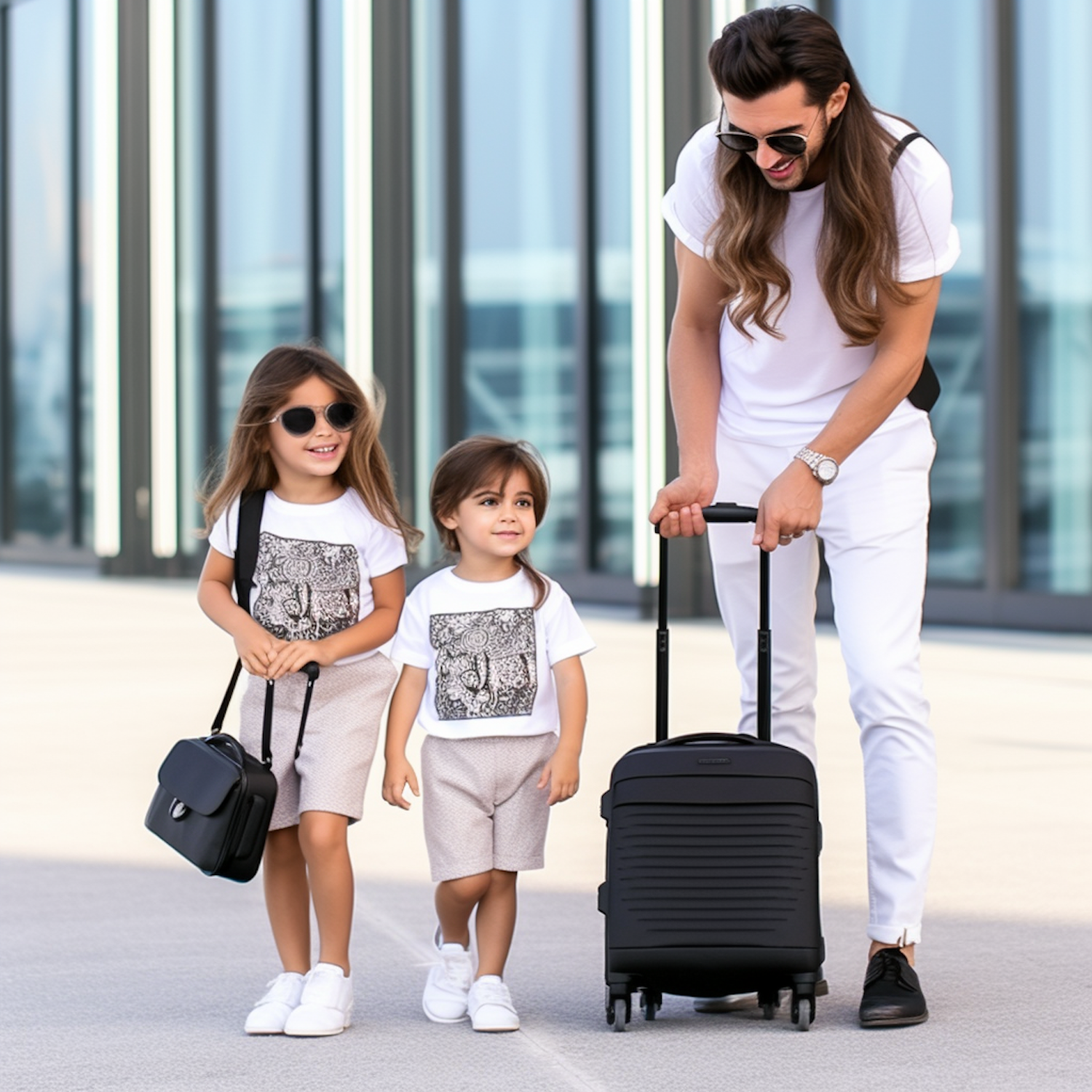 A stylish man and two young girls in matching outfits walk with a suitcase in a modern urban setting, exuding travel vibes.