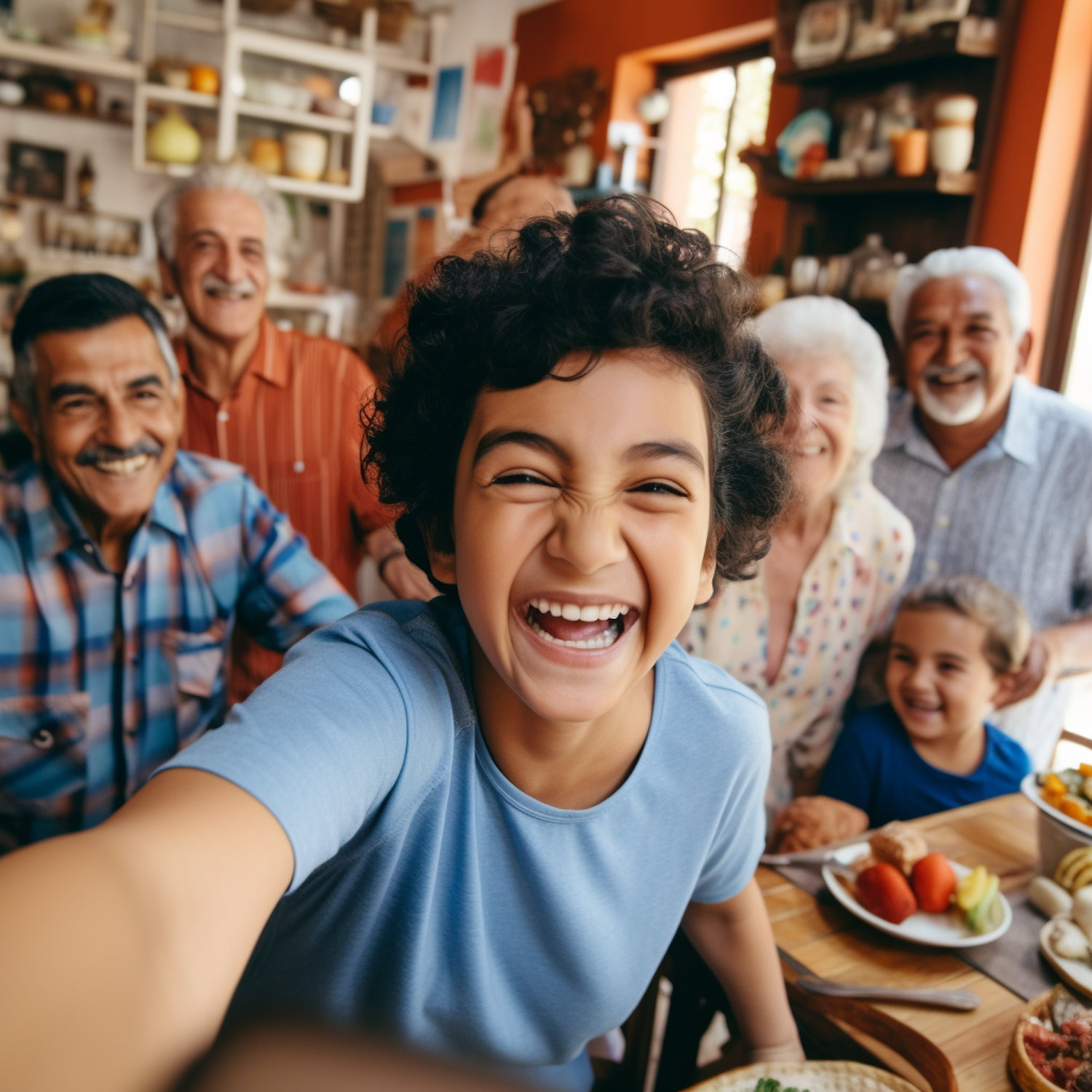 A joyful family selfie with a young boy and his relatives in a cozy kitchen setting, filled with laughter and warmth.