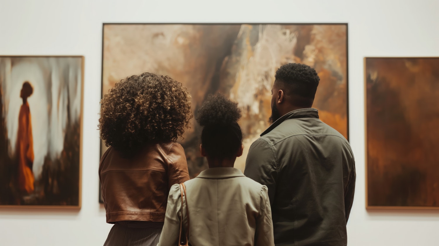 A family admires abstract art in a gallery, surrounded by warm-toned paintings. The scene captures a moment of shared contemplation.