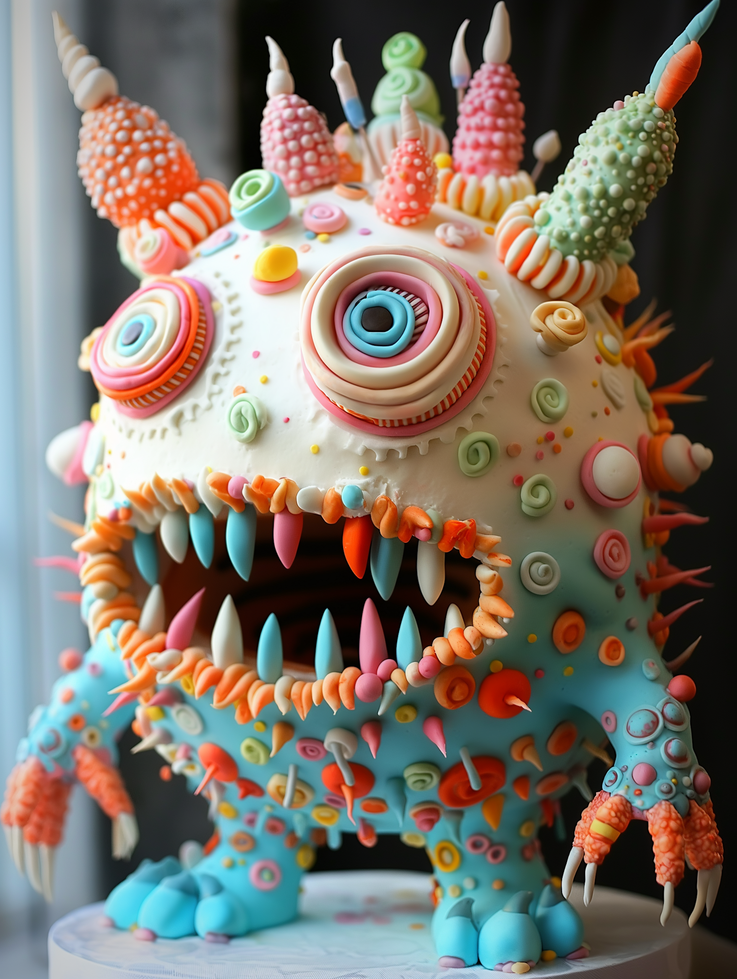 Colorful monster sculpture with candy-like spikes and swirls, featuring spiral eyes and sharp teeth in pastel hues.