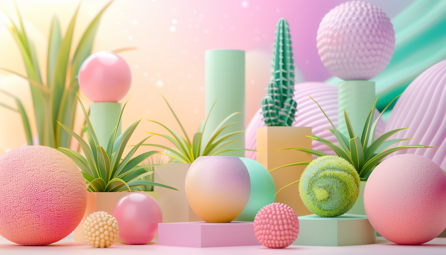 Surreal pastel scene with textured spheres, geometric shapes, and spiky plants in a dreamy gradient background.