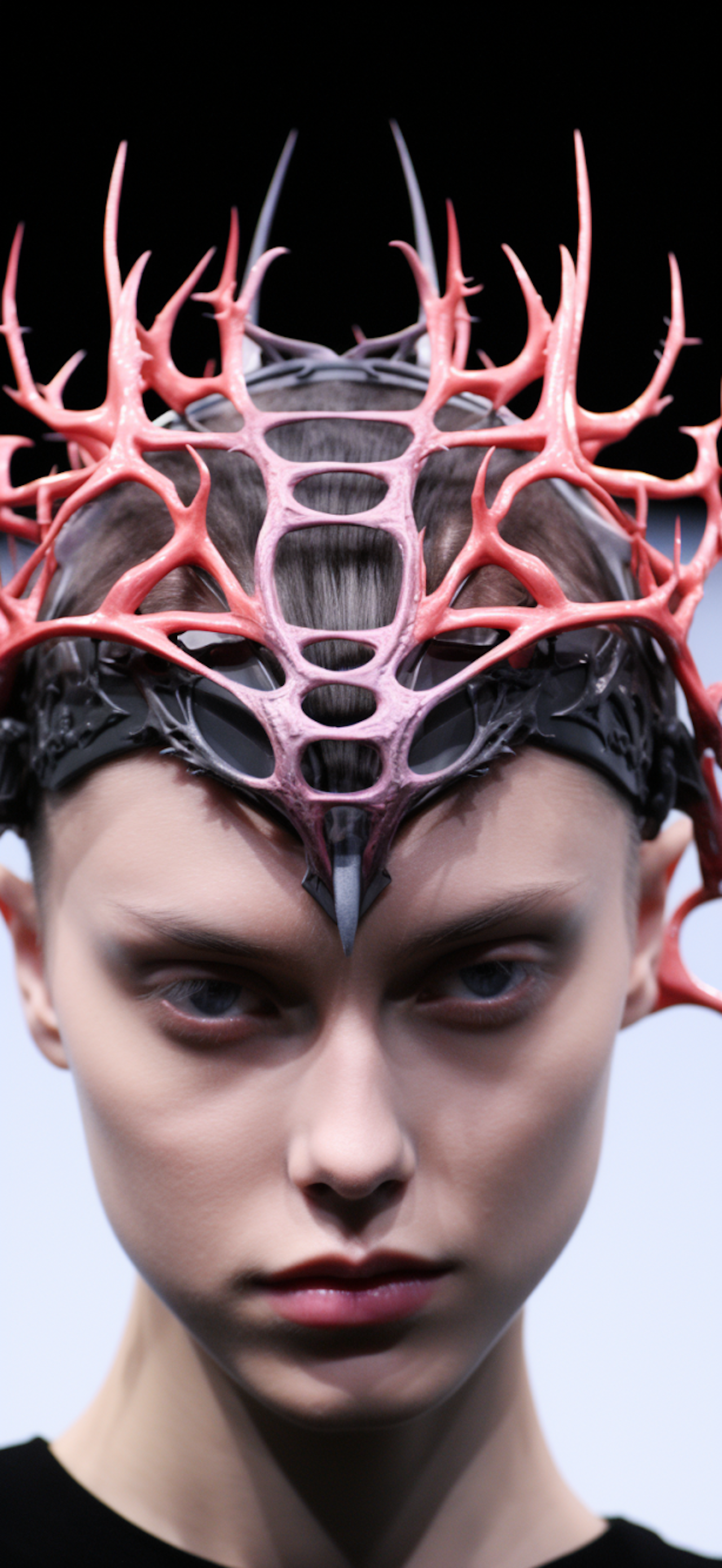 A person wearing a striking pink and black headpiece resembling coral or antlers, with a neutral expression and light blue eyes.