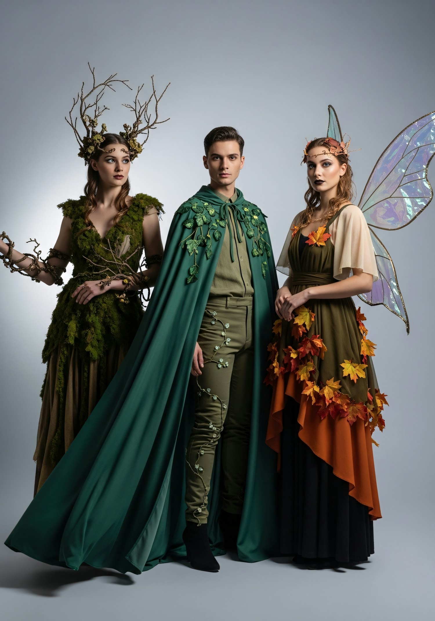 Three individuals in nature-inspired fantasy costumes, featuring moss, leaves, and fairy wings, set against a neutral background.