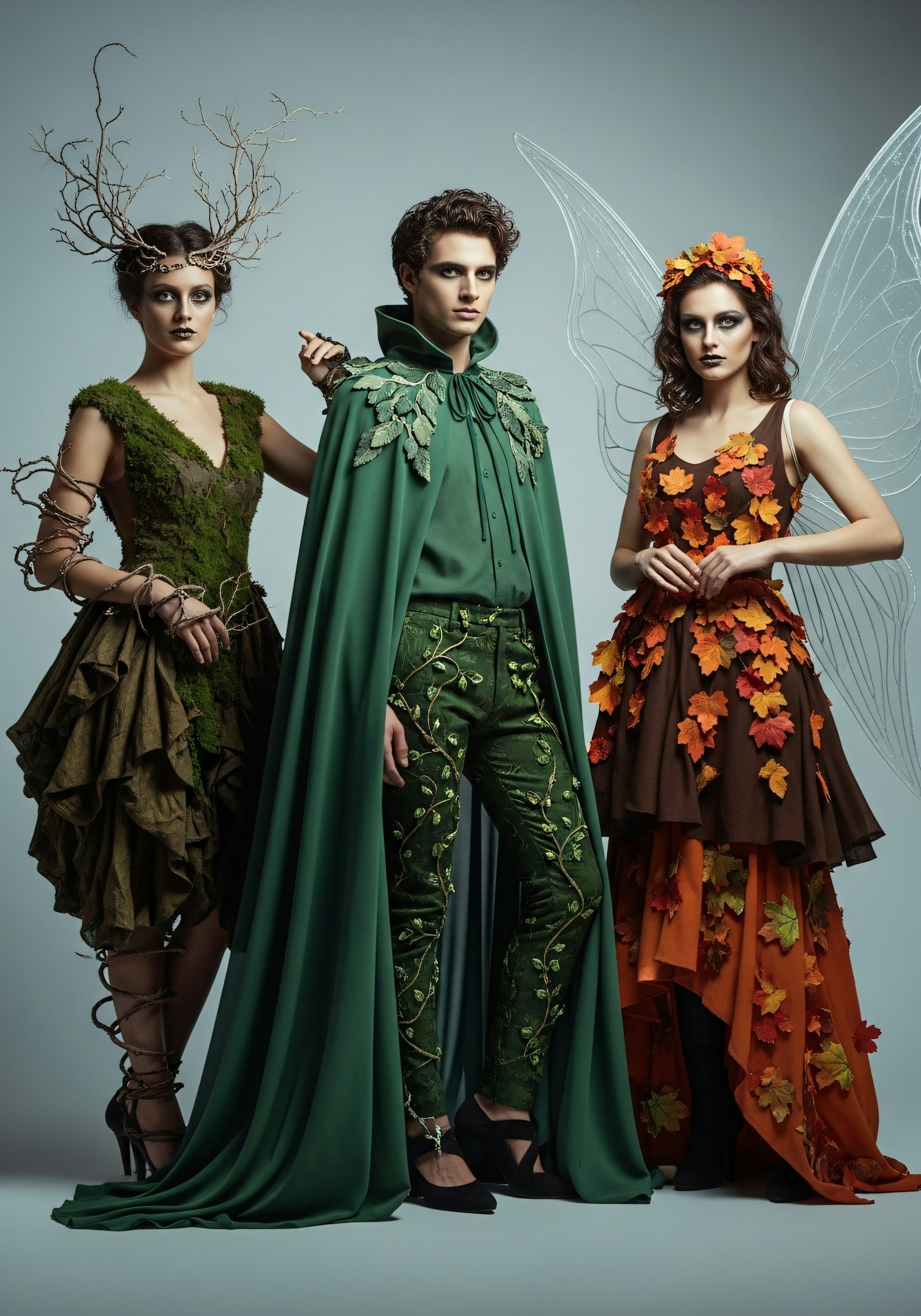 Three individuals in nature-inspired fantasy costumes, featuring moss, leaves, and fairy wings, set against a neutral background.