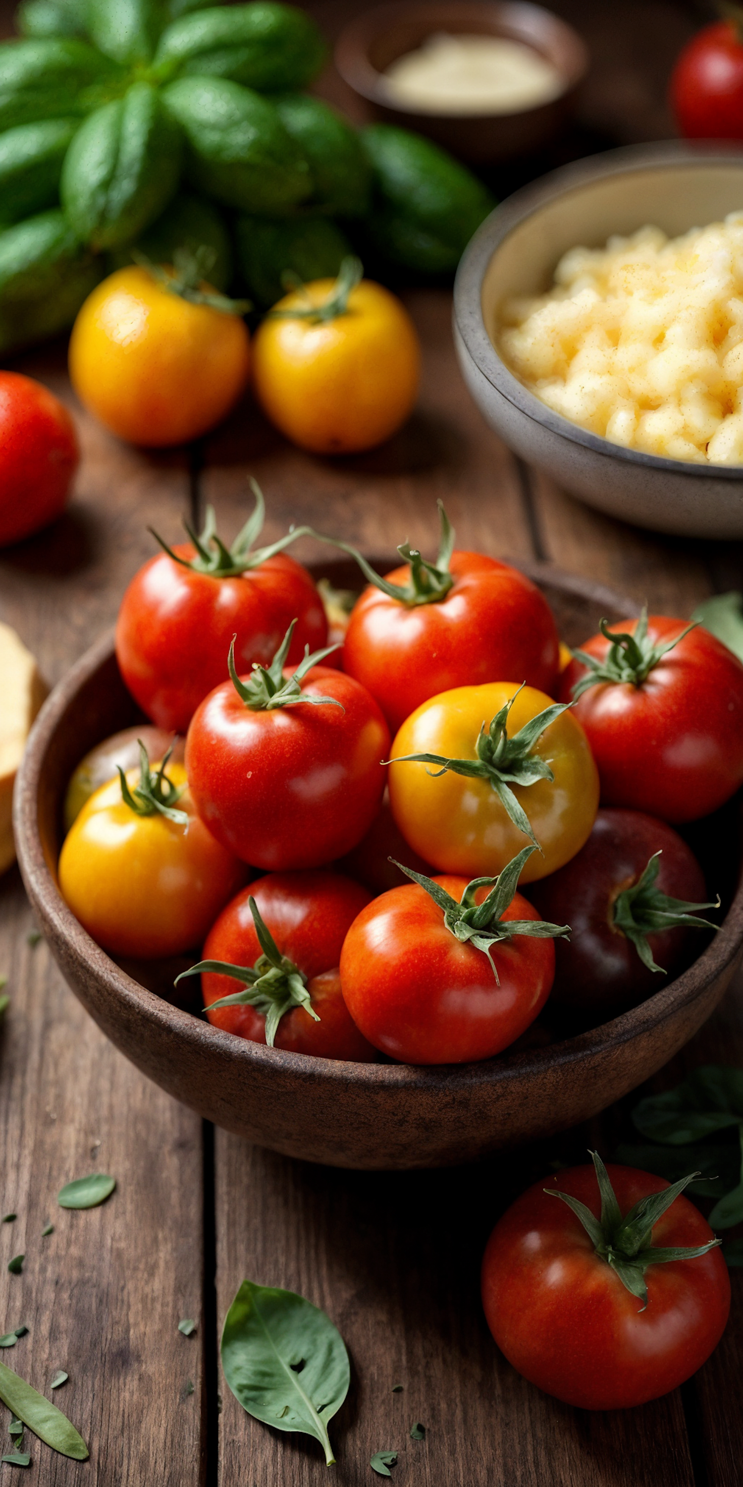 A rustic arrangement of fresh tomatoes, cucumbers, and basil on a wooden table, paired with a bowl of creamy mashed potatoes.