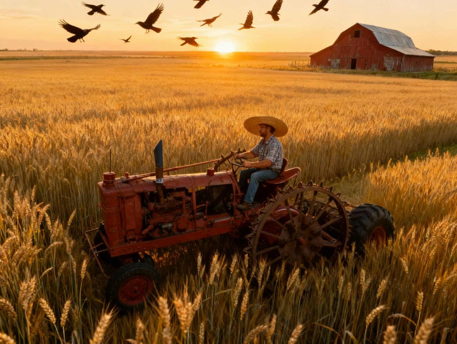A farmer on a red tractor in a golden wheat field at sunset, with a flock of birds flying and a red barn in the background.
