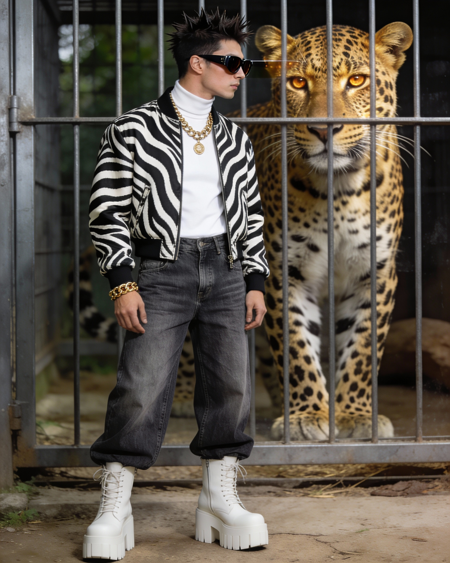 a high fashion editorial photograph featuring a confident male model posed in front of a zoological leopard cage, wearing a striking black and white zebra patterned bomber jacket over a crisp white turtleneck, chunky gold necklace and bracelet and lose fitting denim jeans and chunky white platform boots. his short spiked dark hair accentuating his sculptured jawline. gazes towards the leopard through sleek dark lensed designer sunglasses. behind him, a majestic leopard with a luminous golden spotted coat and piercing amber eyes within a steel cage, creating an intense focal point that mirrors the model's bold pattern play. the scene is shot outdoors with natural lighting emphasizing both the model's avant garde styling and the wild beauty of the caged leopard.