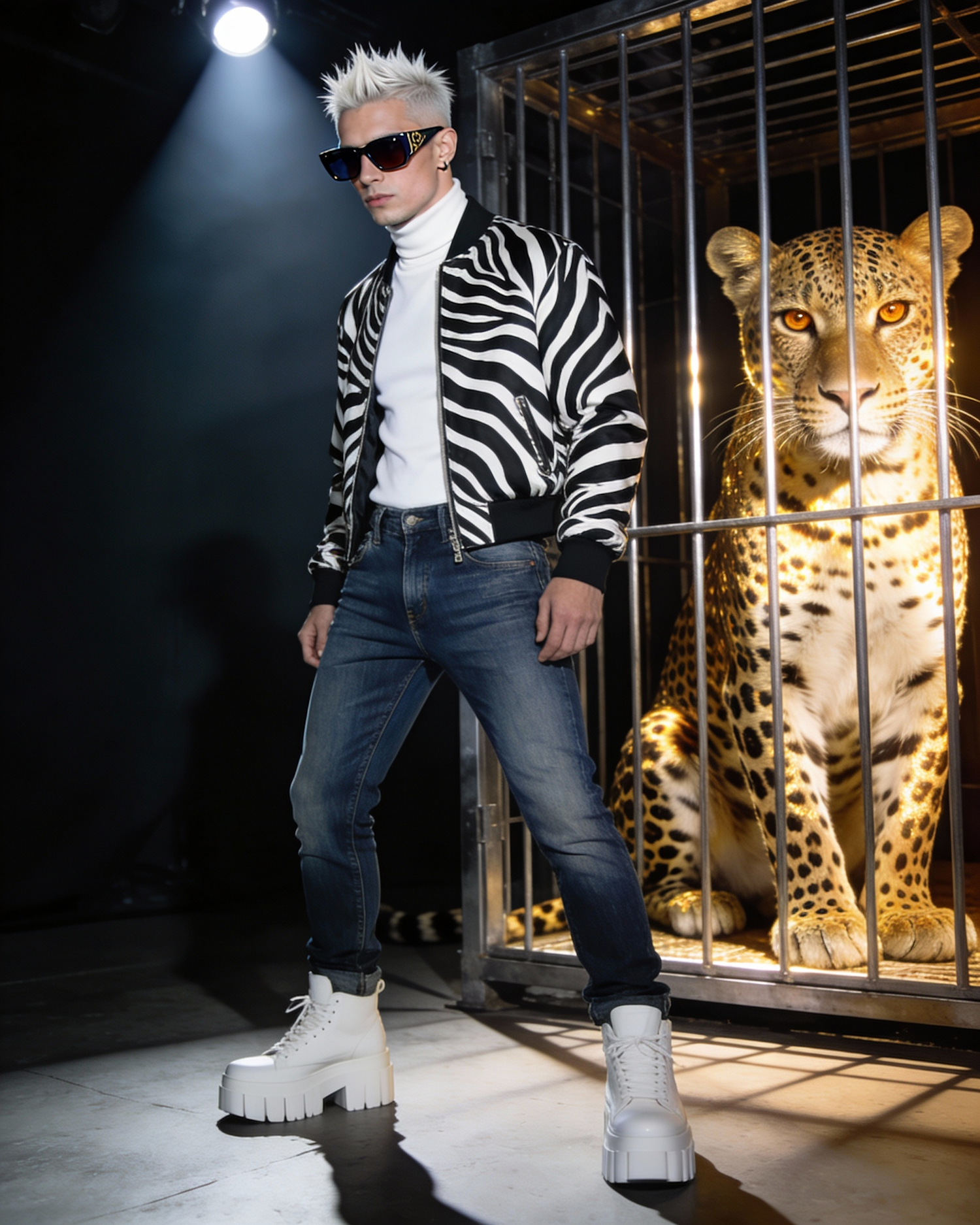 a high fashion editorial photograph featuring a confident male model posed in front of an illuminated leopard cage, wearing a striking black and white zebra patterned bomber jacket over a crisp white turtleneck. with fitted indigo denim jeans and chunky white platform sneakers, his short spiked platinum hair accentuating his sculptured jawline .he gazes through sleek designer sunglasses with dark lenses. behind him, a majestic leopard with a luminous golden spotted coat and piercing amber eyes within a steel cage, creating an intense focal point that mirrors the model's bold pattern play. the scene is shot with theatrical spotlighting that creates stark contrasts and dramatic shadows, emphasizing both the model's avant garde styling and the wild beauty of the caged leopard.