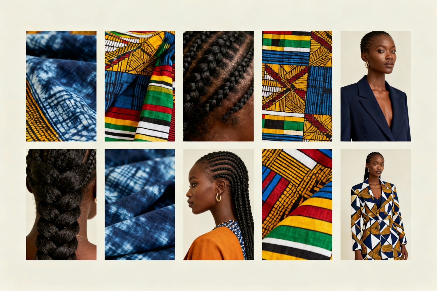 A collage showcasing vibrant textiles, intricate braids, and a stylish model in patterned clothing, celebrating cultural and modern aesthetics.