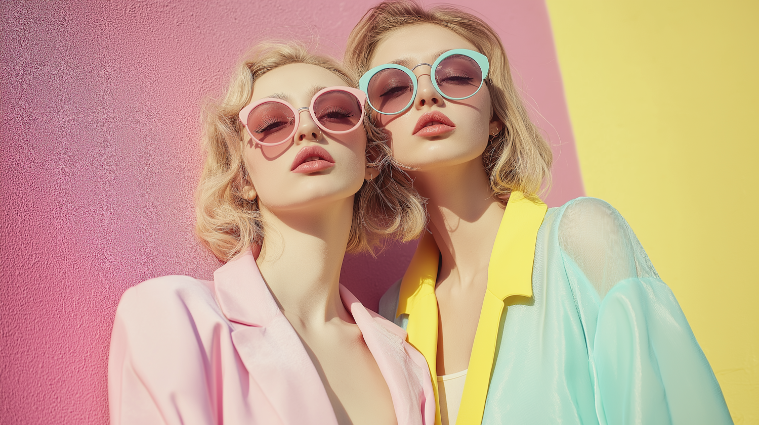 Two stylish women in pastel outfits and oversized sunglasses pose against a vibrant pink and yellow background. Modern and chic aesthetic.