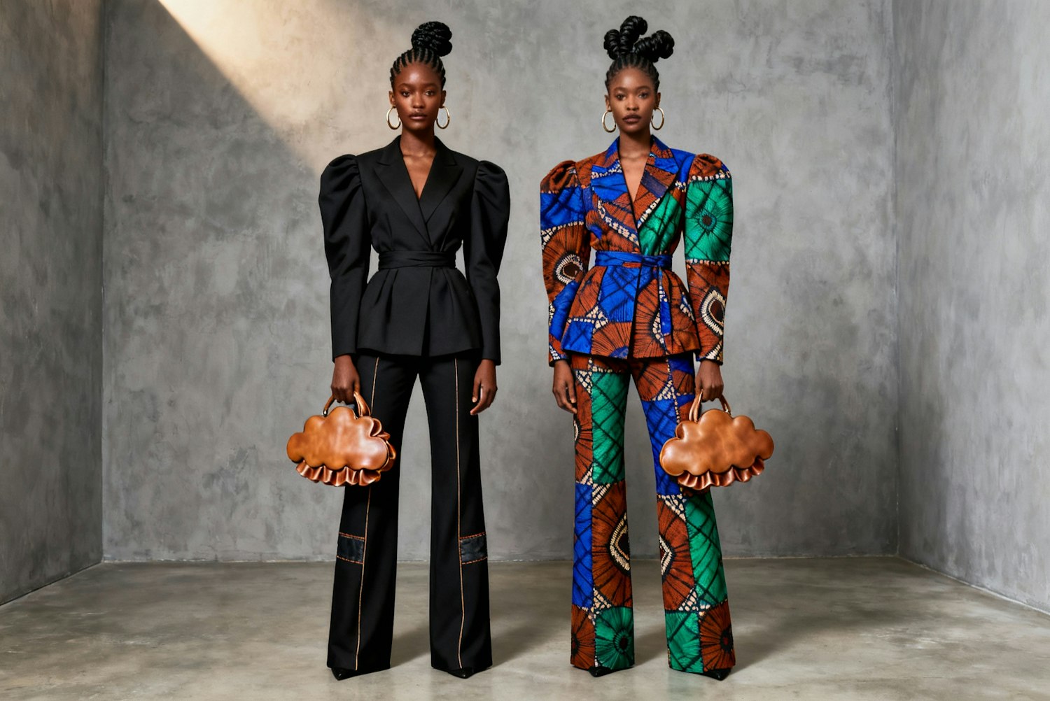 Cinematic, full-body, high-definition professional portrait of two women standing side by side, wearing identical high-fashion pantsuits in complementary colorways—one in deep black, the other in a vibrant contrasting hue (such as indigo, rust, or emerald). One of the women is Black, with radiant brown skin and striking features. Their outfits are fully covered, designed for modesty, yet radiate fierce elegance and commanding strength. Both women stand confidently, exuding poise and presence. Outfit Details: Each woman wears a tailored pantsuit crafted from richly patterned adire fabric, showcasing traditional Yoruba resist-dye motifs reimagined in a contemporary silhouette. The jacket features long sleeves with structured puffed shoulders, a cinched waist, and elongated lines that enhance the silhouette. The matching trousers are sleek and modern, with subtle patchwork or paneling that nods to utilitarian fashion while preserving the artisanal integrity of the textile. Though the design is identical, the colorways are complementary, creating visual harmony and contrast. Styling: Both women wear modern, sculptural hairstyles—think sleek braided updos, twisted buns, or natural curls shaped into clean, architectural forms. Their hair is styled to reflect contemporary elegance while honoring cultural roots. They accessorize with identical vintage asymmetrical ruffle clutch bags crafted from leather, resembling soft clouds—an editorial accent that reinforces their unified yet individual style. Large hoop earrings add a bold finishing touch. Setting & Mood: The backdrop is minimalist: textured gray walls and a smooth concrete floor. Soft, directional lighting highlights the intricate textures of the adire fabric and the sculptural elements of their styling. The overall composition is cinematic, sharply focused, and evokes a high-fashion editorial with avant-garde artistry and cultural depth.