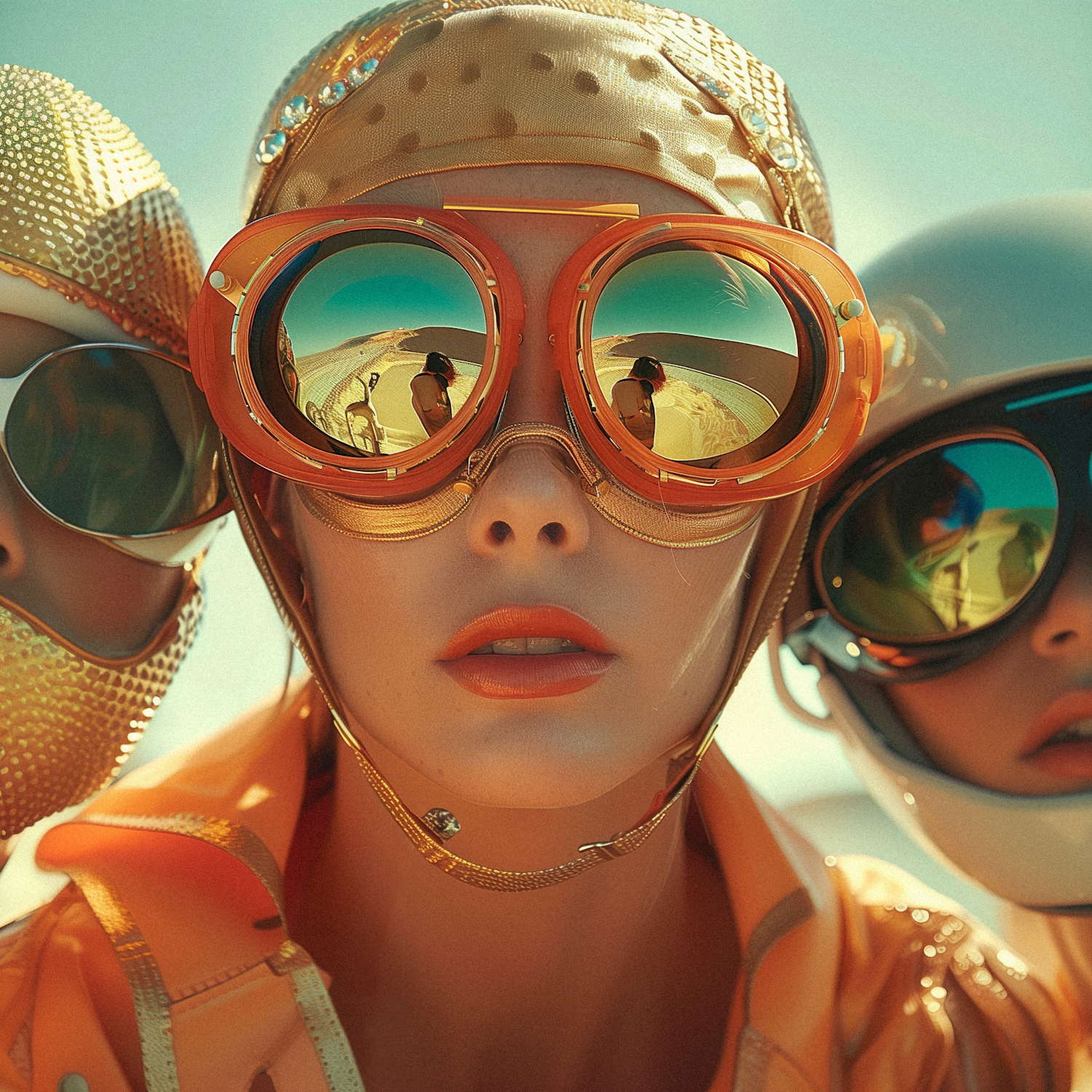 Three individuals in retro-futuristic goggles and headgear reflect a desert scene, creating a vibrant, surreal aesthetic.