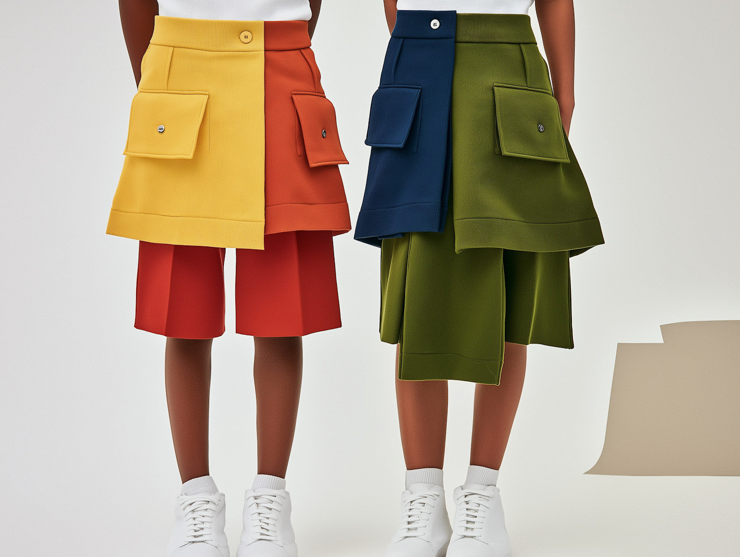 Two models in colorful skirts and shorts with large pockets, wearing white sneakers against a neutral background.