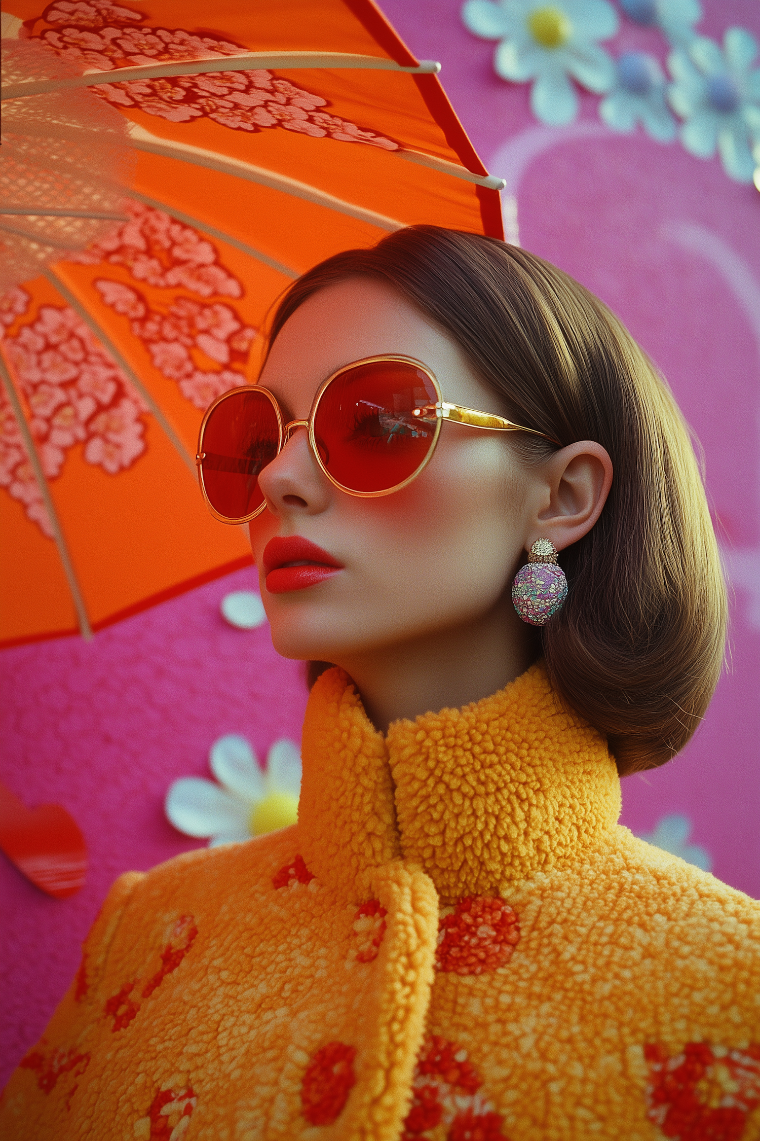 Stylish woman in orange sunglasses and yellow coat with floral patterns, holding a parasol against a vibrant pink floral background.