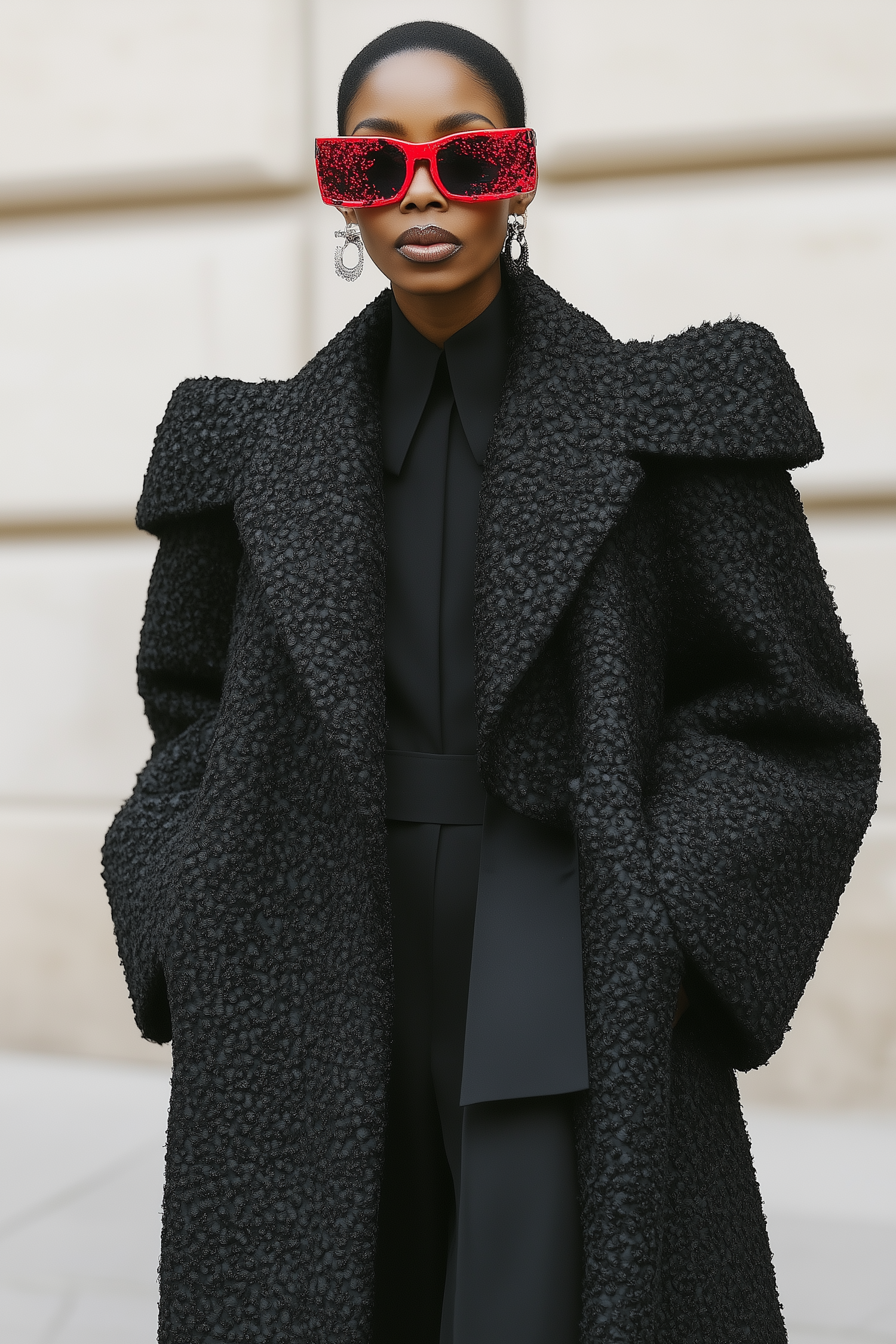 Chic Black woman in textured black coat and bold red sunglasses, exuding elegance and style with glamorous earrings.