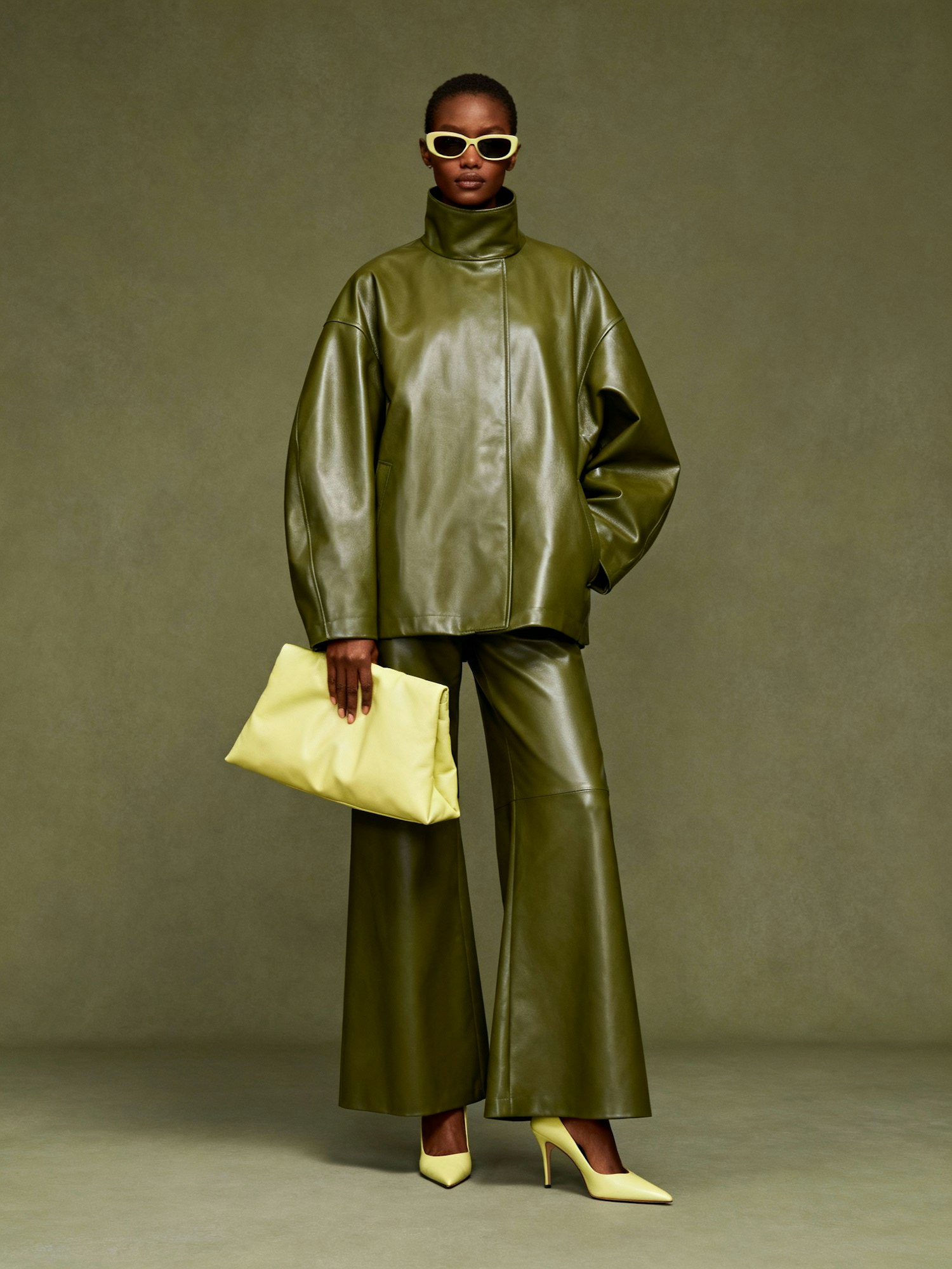 A confident woman standing against a plain muted olive-gray background that complements her warm brown skin tone and the sleek tones of her outfit. She wears a high-neck oversized olive green leather jacket with a glossy finish, paired with wide-leg matching leather pants. Accessories include a large pale yellow clutch bag, pointed-toe high heels in pale yellow, and sunglasses. The look blends monochromatic polish, texture contrast, and contemporary elegance in a bold editorial composition
