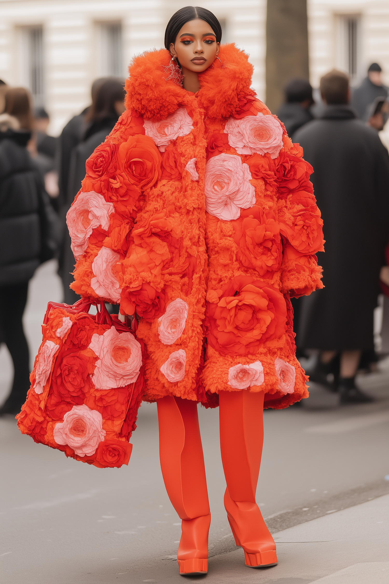 A woman in a bold orange floral coat and matching bag stands confidently on a city street, showcasing vibrant fashion style.