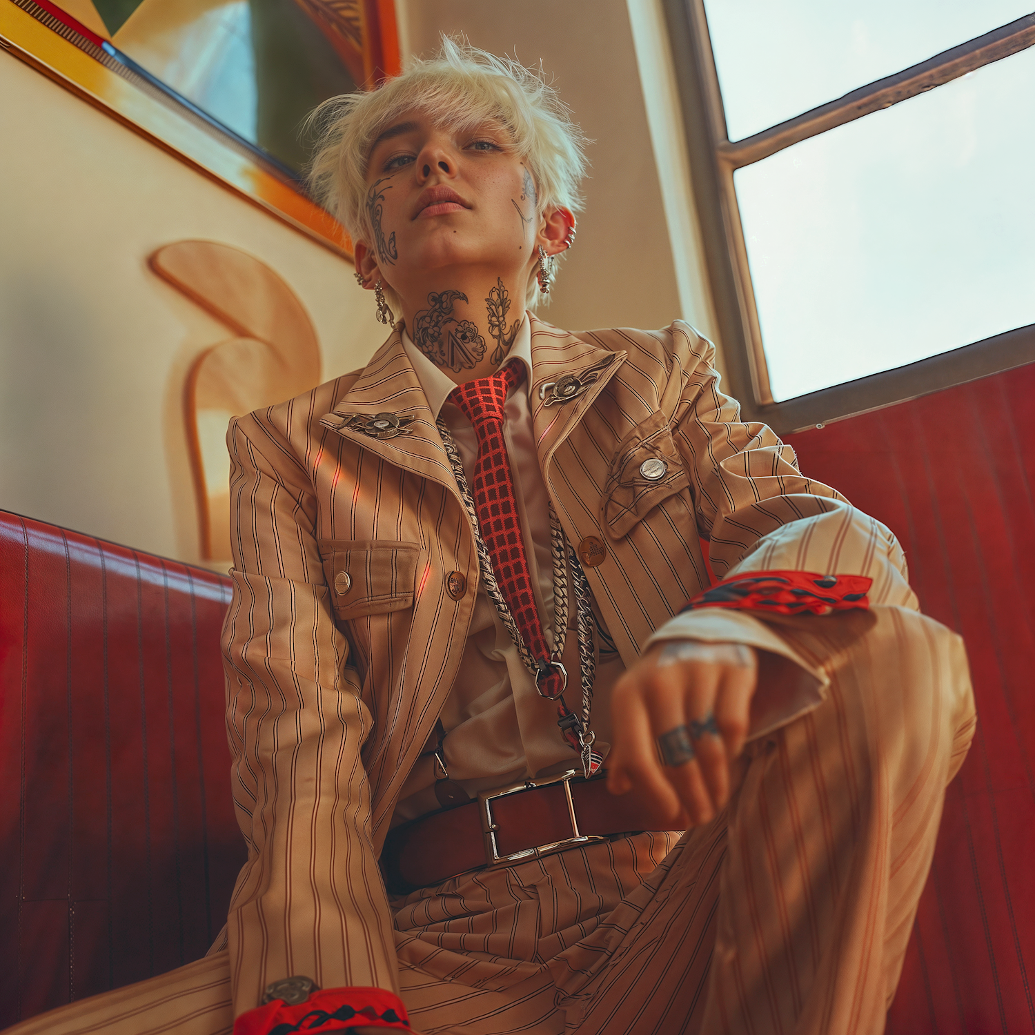 Stylish person with tattoos in a beige pinstripe suit and red tie, sitting confidently in a modern setting with natural light.