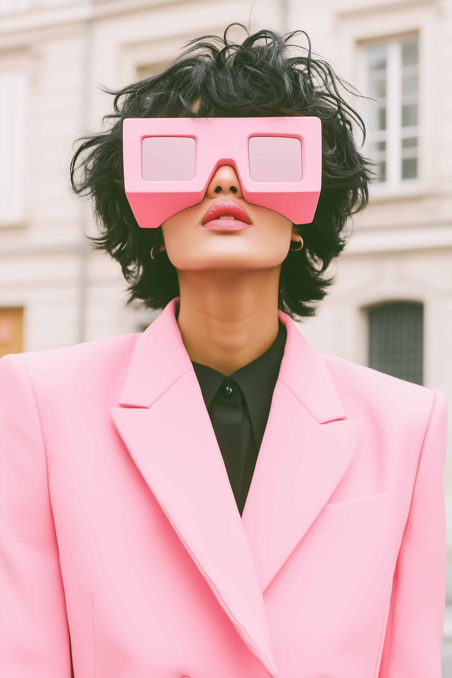 Fashion-forward individual in pink blazer and oversized sunglasses, exuding modern style in an urban setting.
