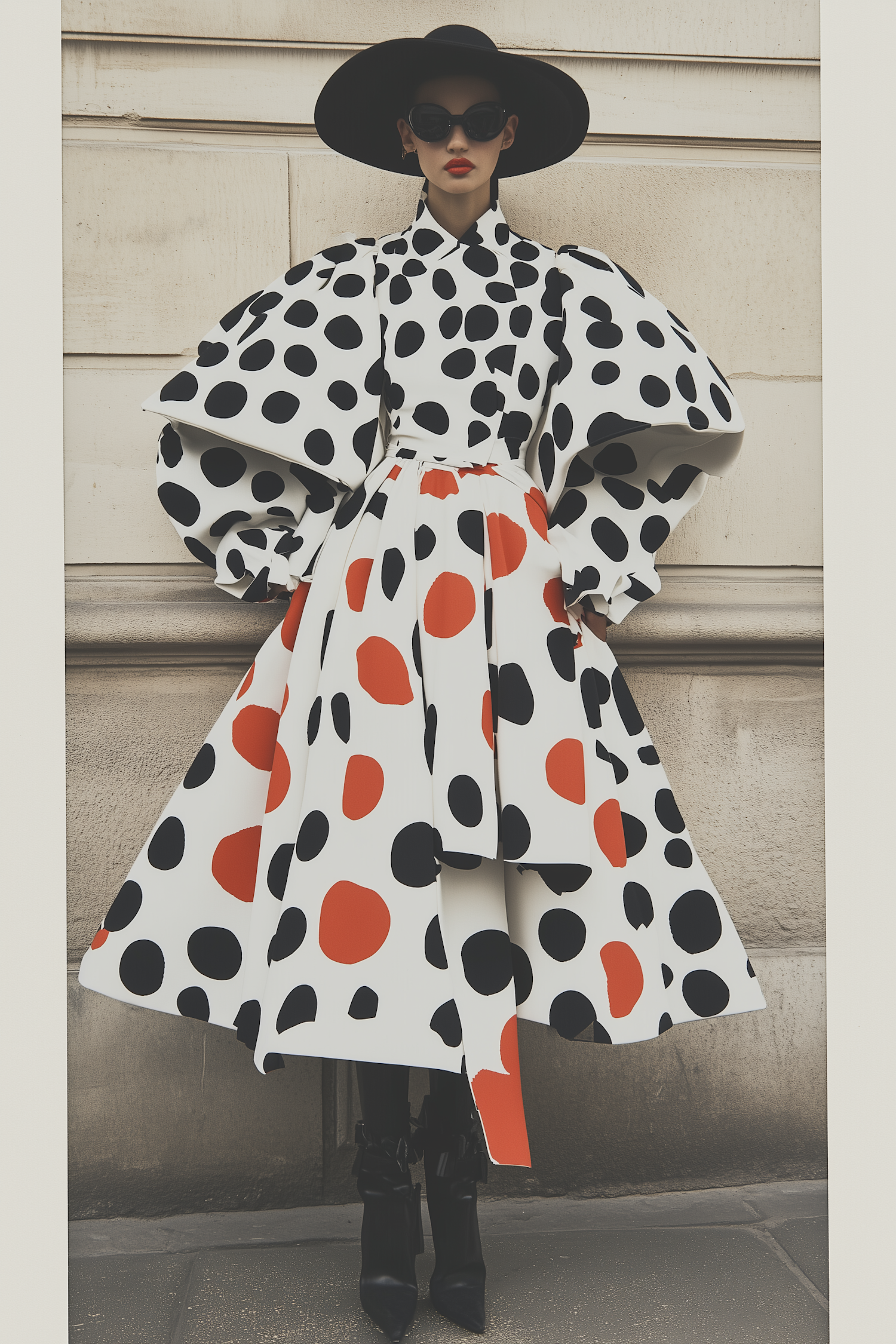 Bold polka dot dress with puffed sleeves, paired with a wide-brimmed hat, sunglasses, and black boots for a dramatic high-fashion look.