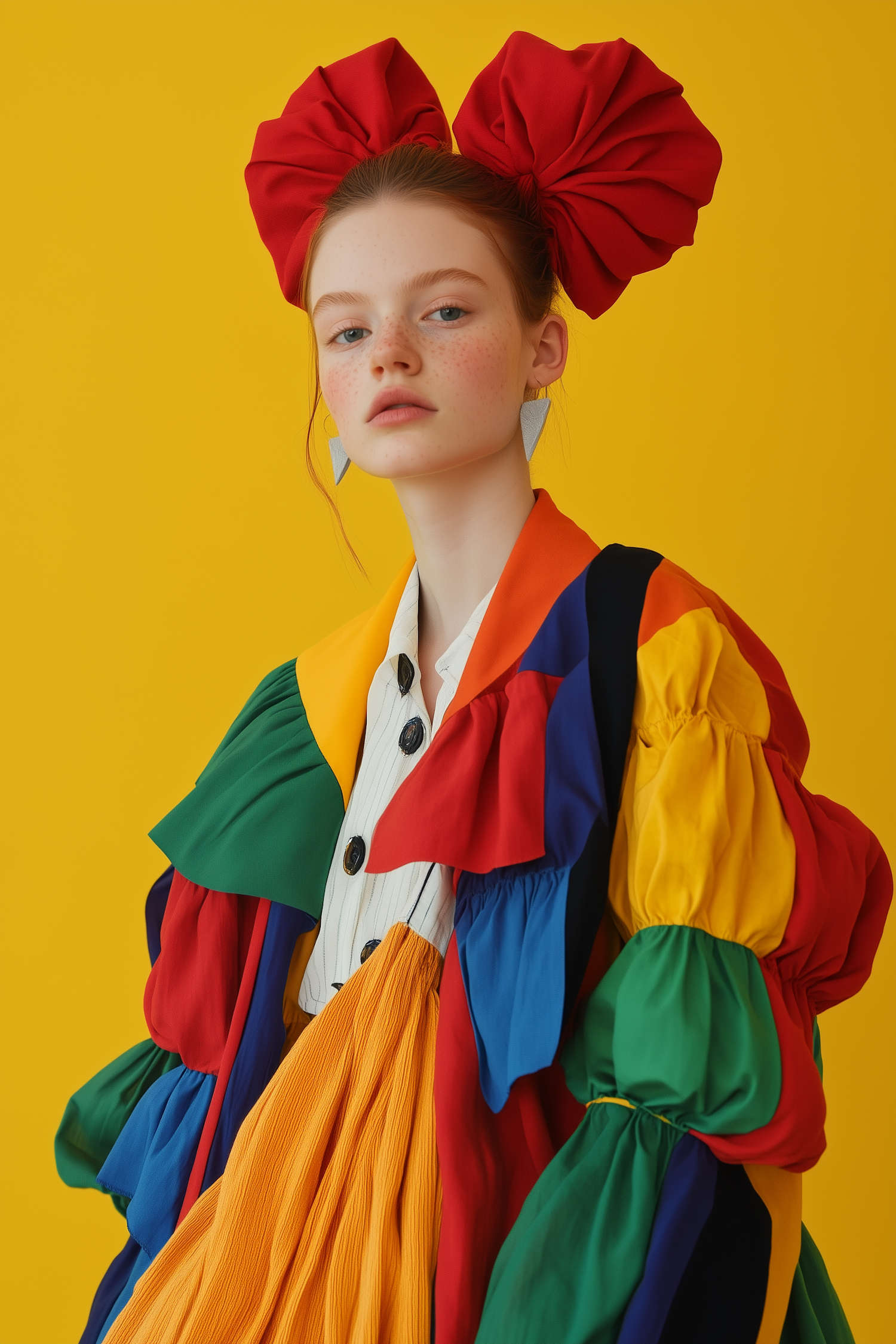 A young woman in a colorful, voluminous outfit with red bows in her hair against a vibrant yellow background.