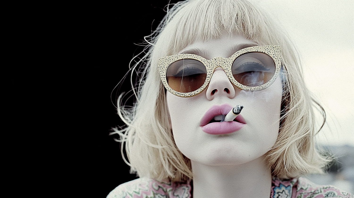 Stylish woman with blonde hair and sunglasses, holding a cigarette against a black background, exuding a retro and edgy vibe.