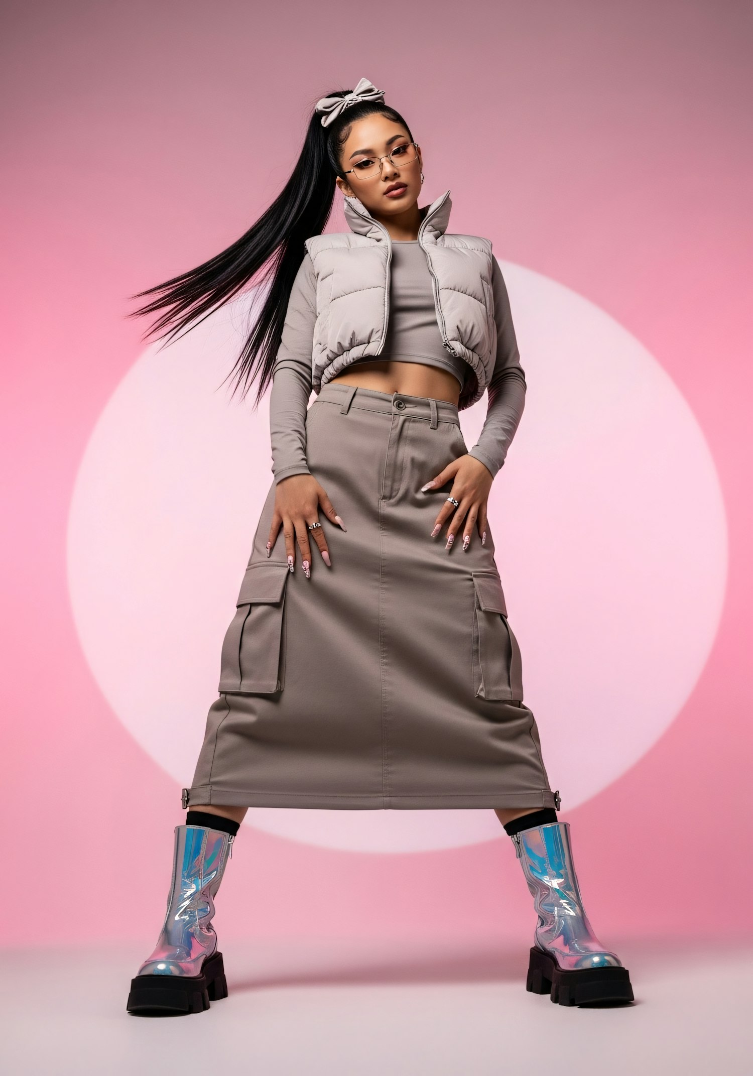 A fashionable individual poses in a modern outfit with a pink background, showcasing a stylish puffer vest, utility skirt, and iridescent boots.