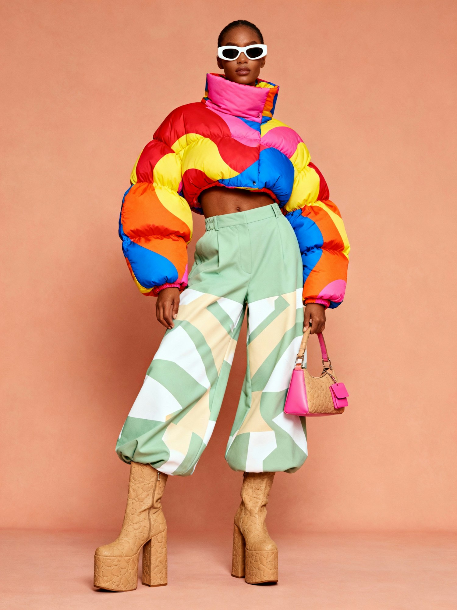 A bold fashion look featuring a colorful puffer jacket, patterned pants, platform boots, and stylish accessories against a peach backdrop.