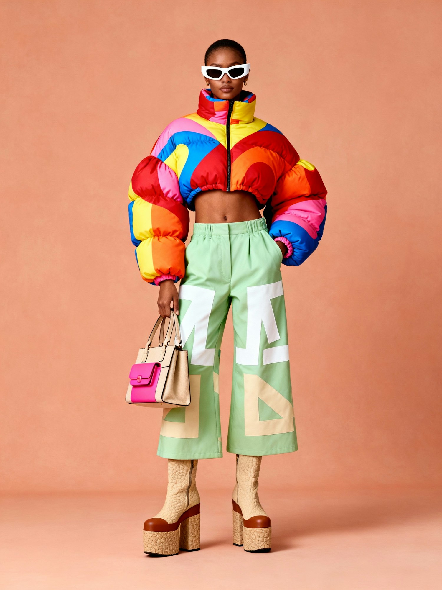 A bold fashion look featuring a colorful puffer jacket, green pants, platform boots, and stylish accessories against a peach backdrop.