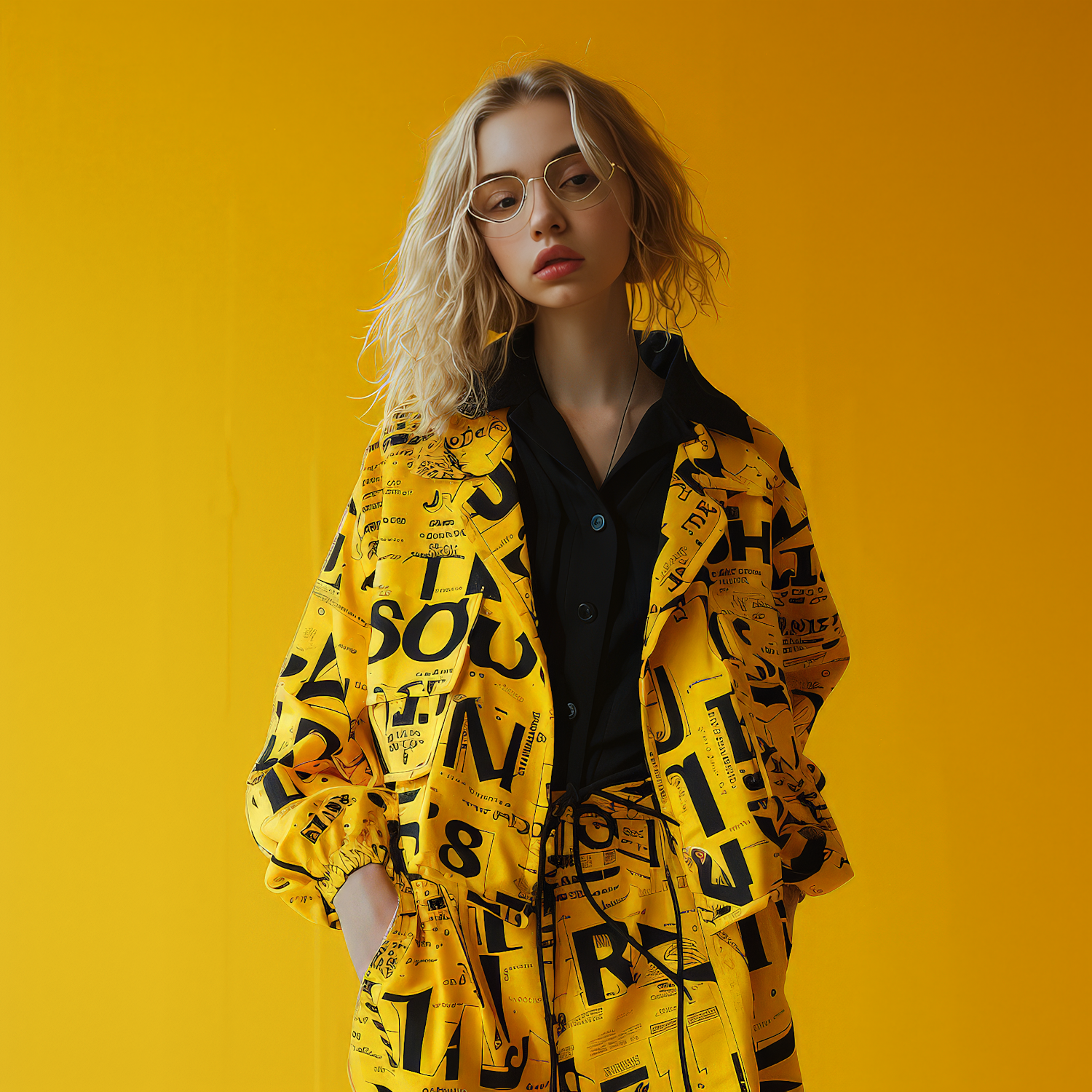 Stylish woman in bold yellow outfit with black text, standing against a vibrant yellow background. Modern and fashionable look.