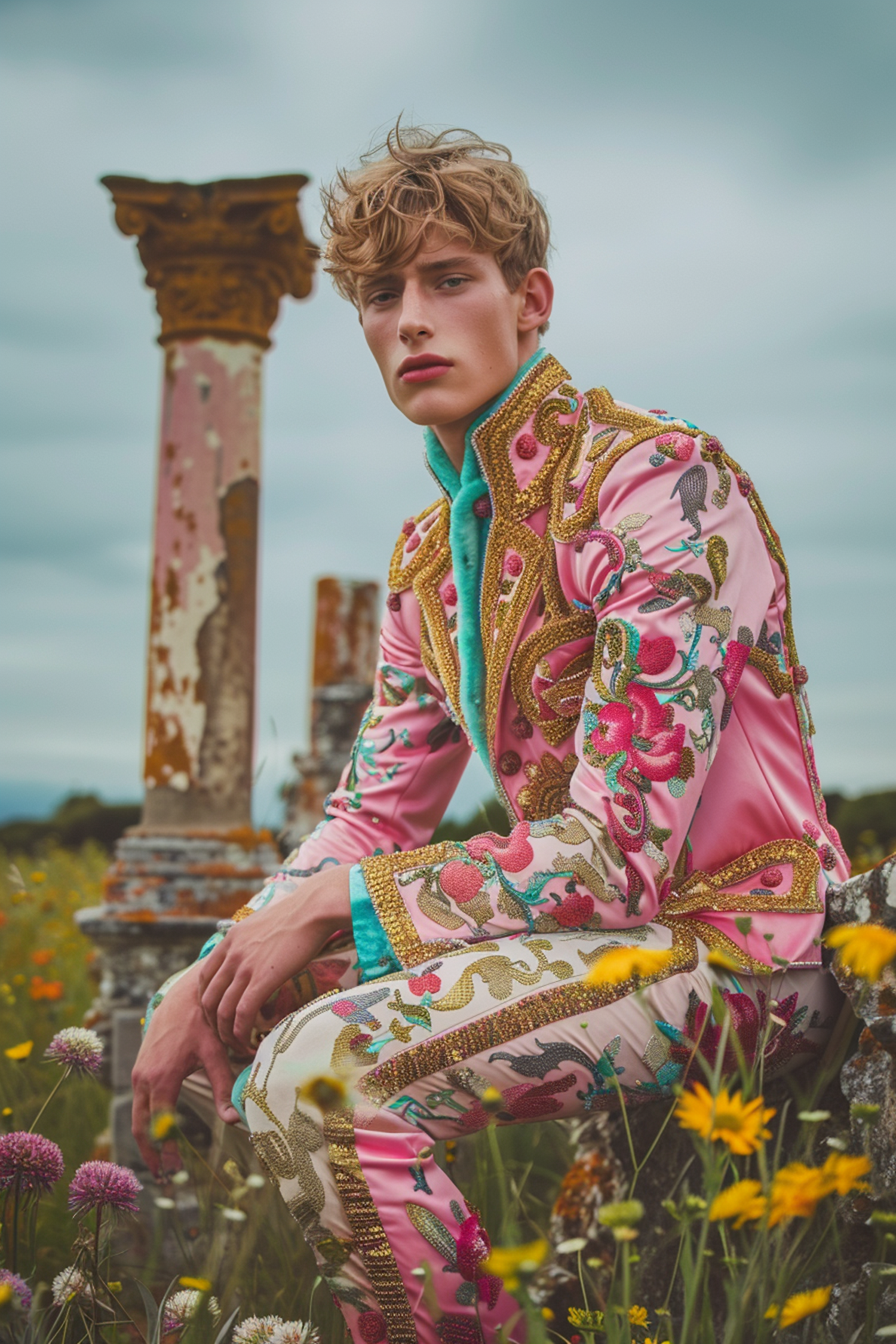 Young man in ornate pink and turquoise suit sits in a wildflower field with ancient columns in the background.