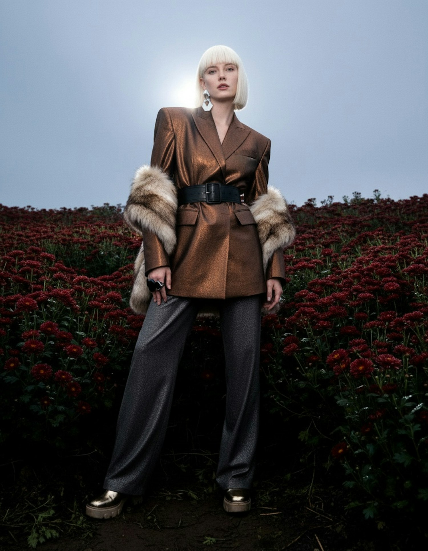 A stylish individual in a metallic outfit poses in a field of red flowers under a dramatic sky, showcasing bold fashion and elegance.