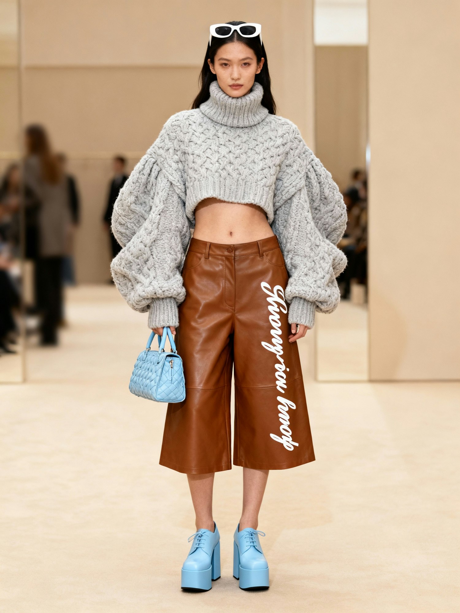A confident woman standing indoors against a plain background that complements her warm brown skin tone. She wears a textured, oversized light gray turtleneck sweater with voluminous sleeves and a cropped design that reveals her midriff. Her high-waisted, wide-legged brown leather shorts feature vertical white cursive writing, adding a graphic edge. She accessorizes with light blue platform shoes, a matching textured light blue handbag, and white-framed sunglasses. The look is bold, playful, and editorial—blending sculptural knitwear with statement accessories in a modern fashion-forward composition