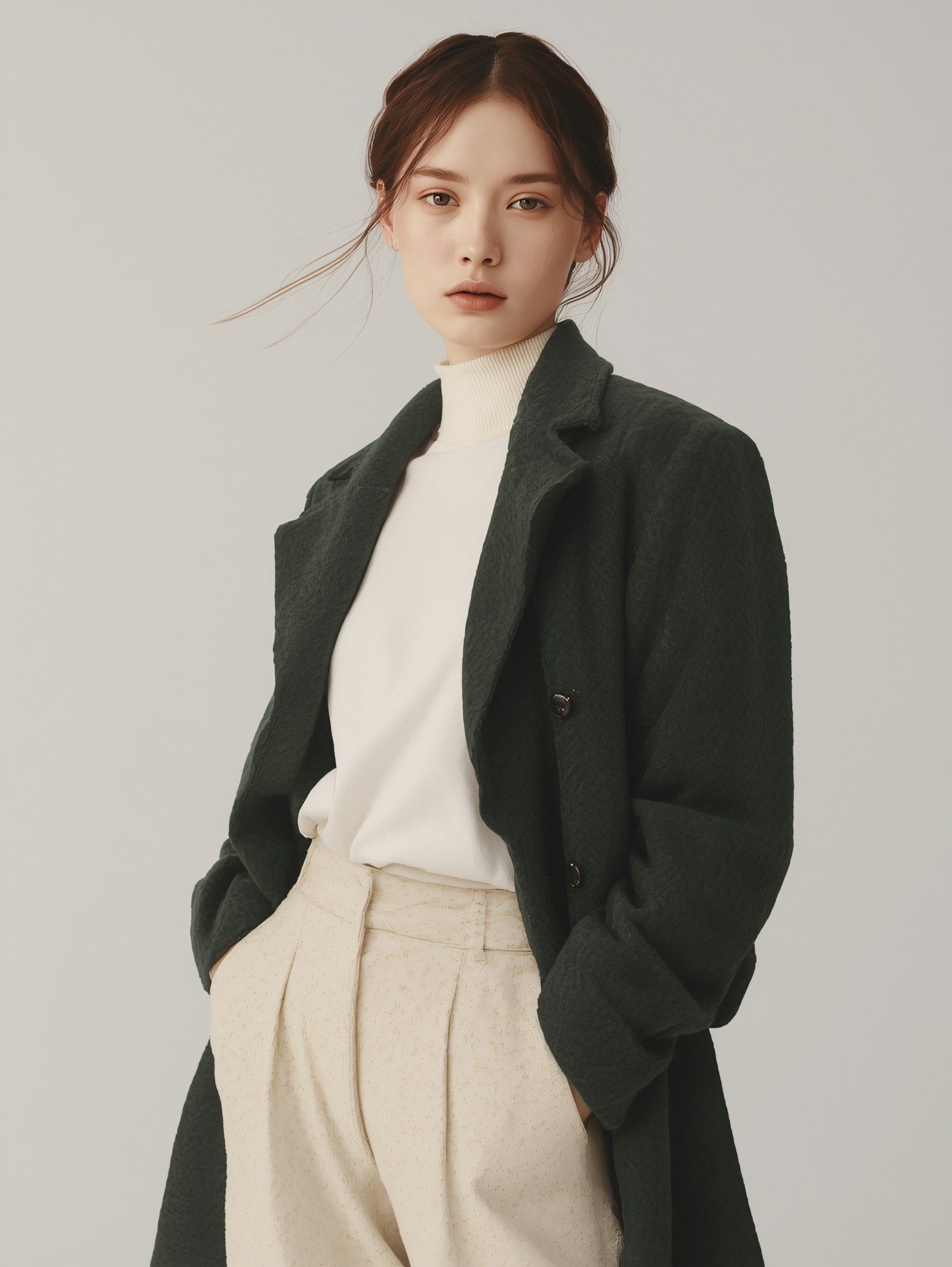 Stylish woman in a dark green coat, white turtleneck, and cream trousers, posing against a light background with a neutral expression.