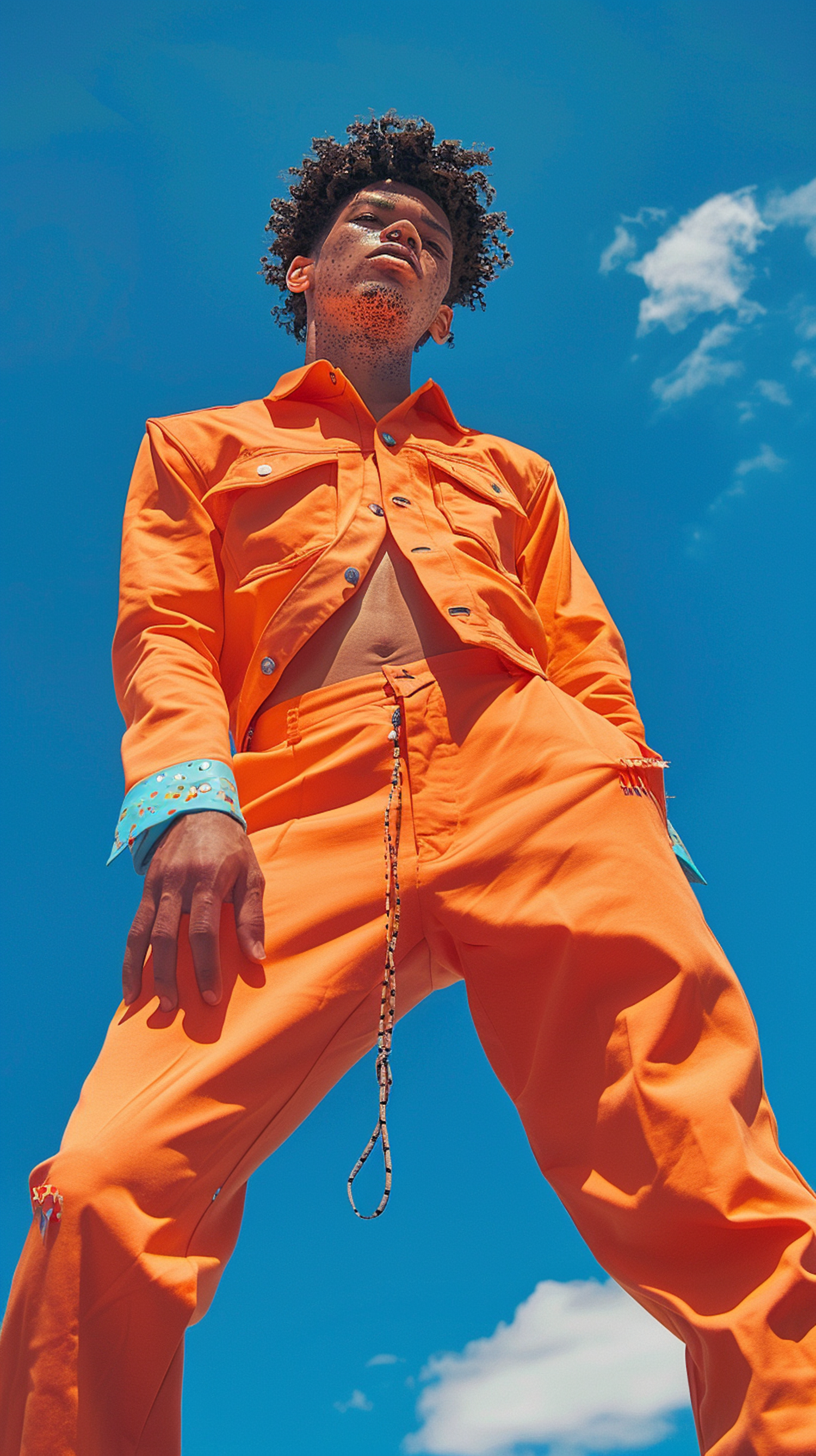 Man in vibrant orange outfit poses confidently against a bright blue sky, showcasing bold fashion and a striking upward angle.