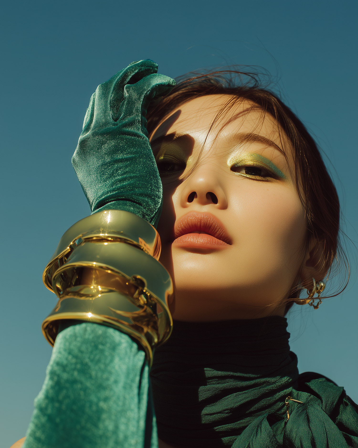 Bold close-up of a woman in green velvet gloves, gold bangles, and shimmering makeup against a clear blue sky. Striking and stylish.