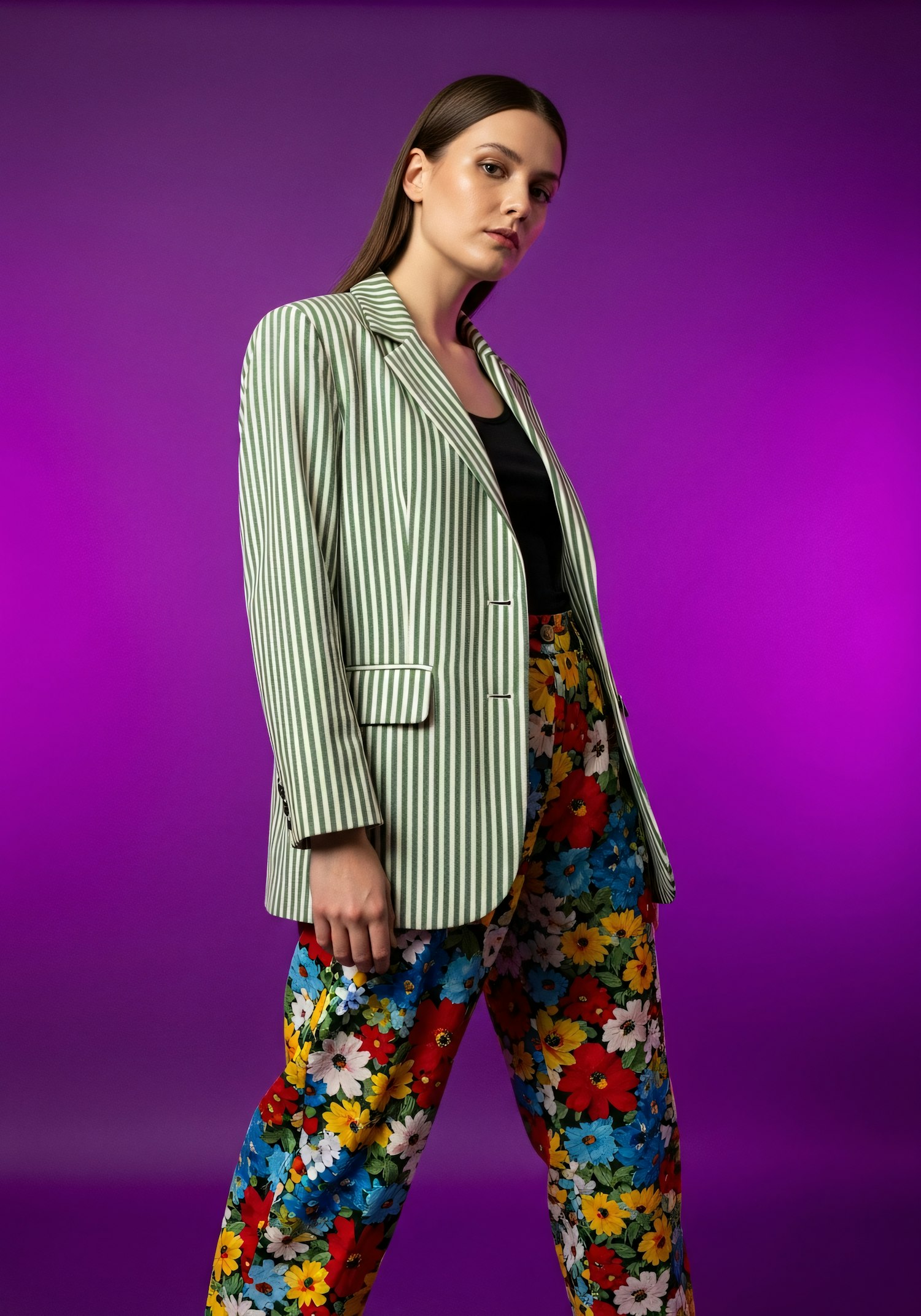 A stylish woman in a striped blazer and floral pants poses against a vibrant purple background, showcasing bold fashion choices.