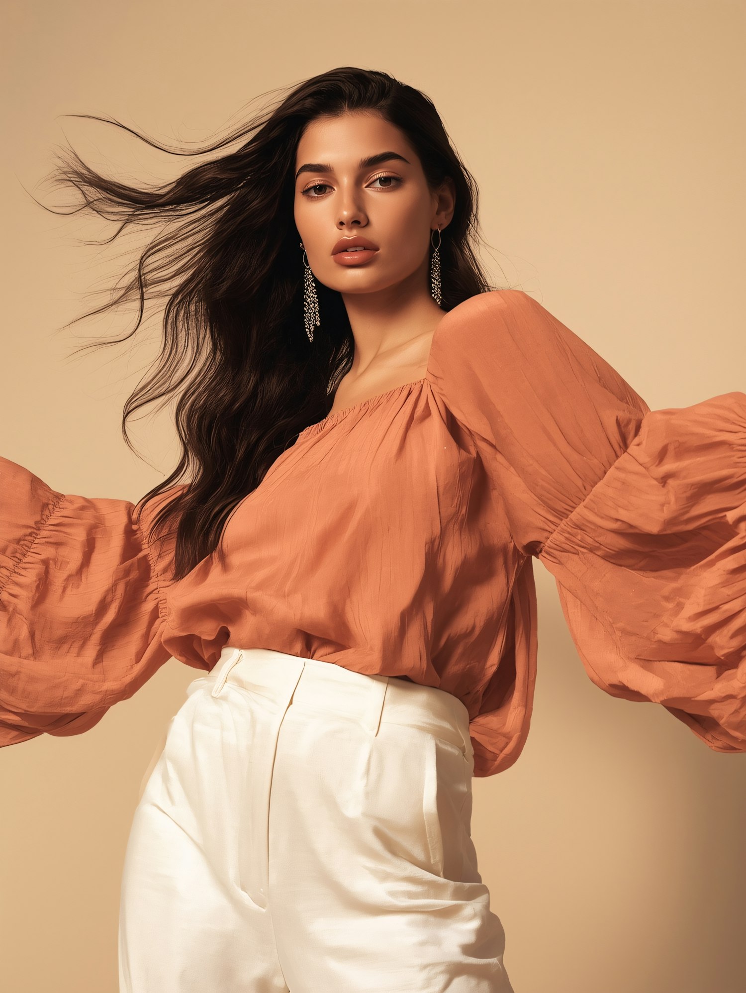 Stylish woman in a flowing orange blouse and white trousers, accessorized with elegant earrings, posing against a beige backdrop.