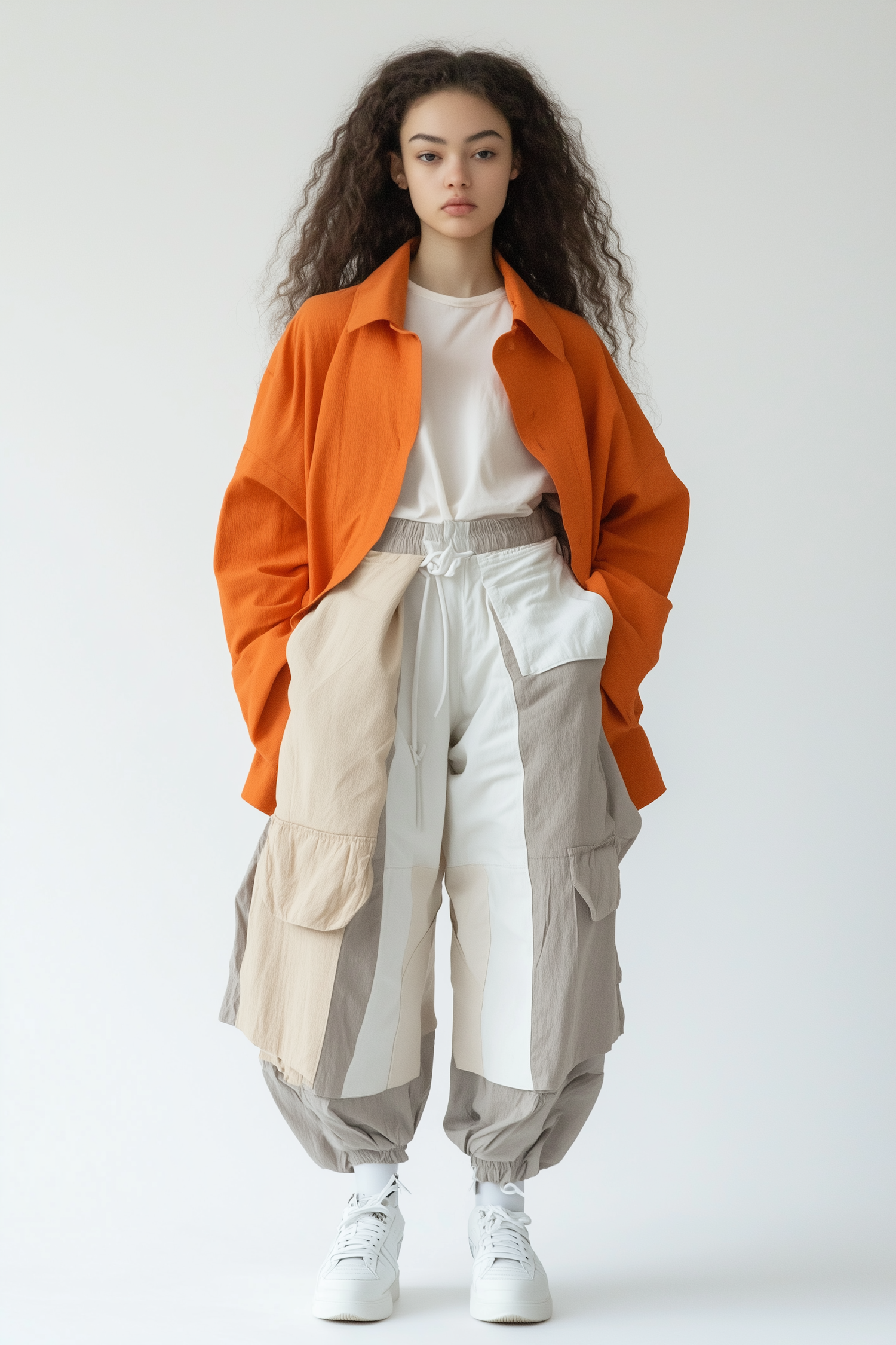 Stylish woman in orange jacket and cargo pants, exuding confidence with a modern, casual look. Perfect blend of fashion and comfort.