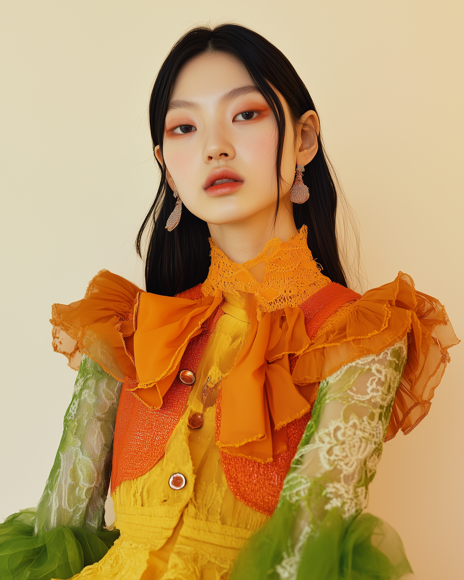 Asian woman in vibrant orange and green lace outfit with bold makeup, standing against a soft yellow background.