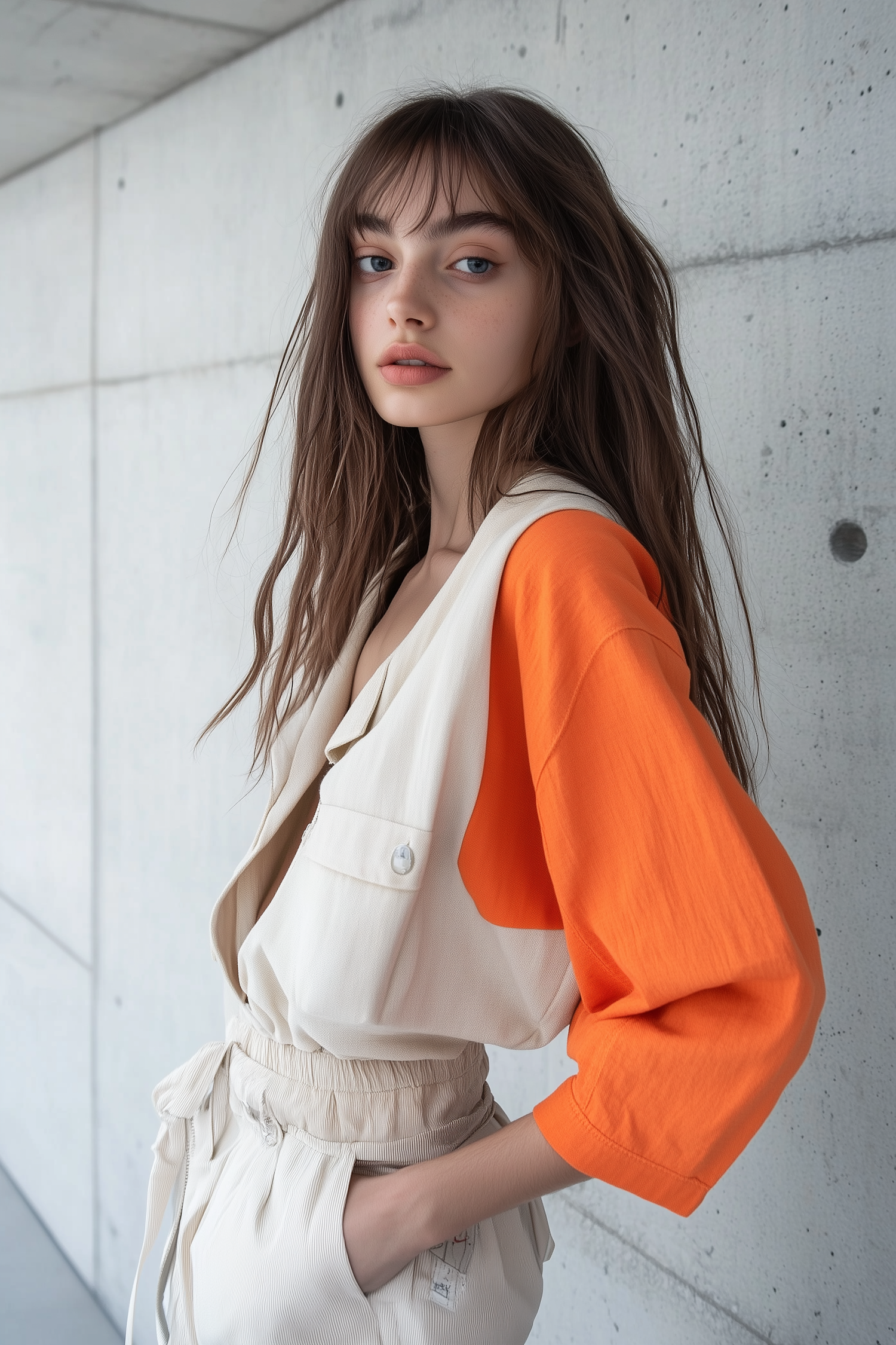 Stylish young woman in beige and orange outfit against a minimalist concrete wall, exuding modern elegance and casual confidence.