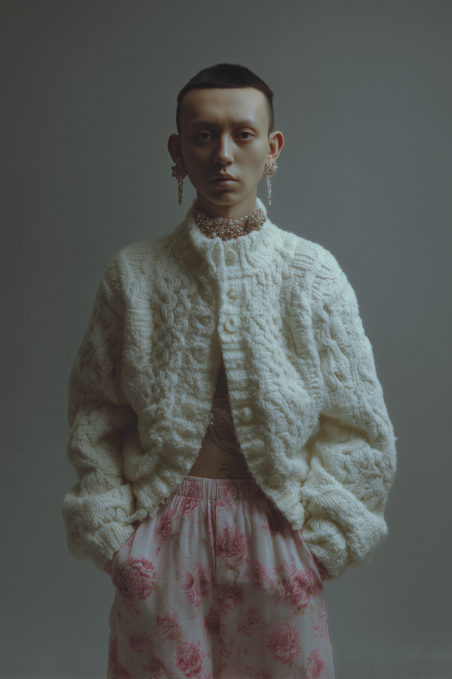 Stylish individual in a white knit cardigan, pink floral pants, and ornate jewelry, set against a neutral background.